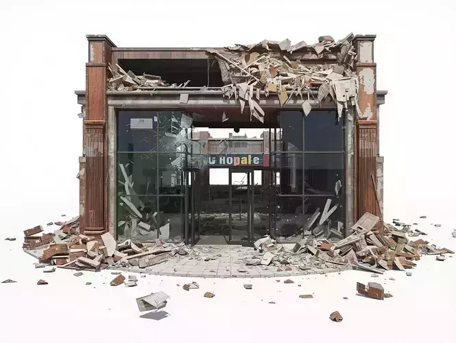 TagsStorefront Commercial Destroyed Ruin Facade Urban PostApocalyptic Rubble Brick Glass Shattered Building Prop GameAsset Realistic Combat War Decay Environment Ruin