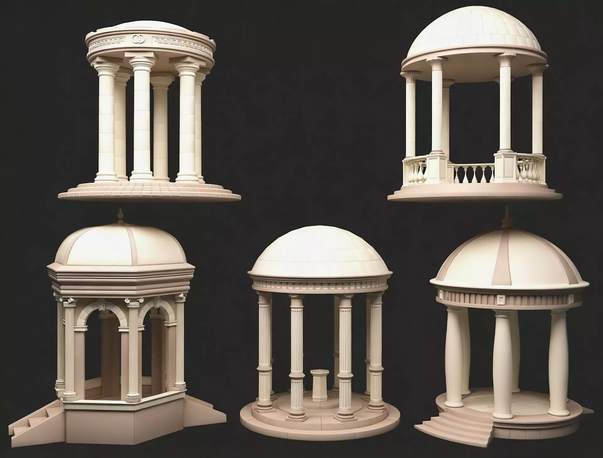 This is a set of 3D white model assets of pavilions in European classical style, showcasing 5 uniquely designed circular/polygonal gazebos. All are presented in a stone texture of off-white and light brown, without complex textures, focusing on the expression of structure and form.Architectural elements: They feature typical Neoclassical characteristics such as Doric/Corinthian orders, arches, domes, balustrades, and steps. Some pavilions are equipped with a central stone pedestal or a viewing platform.Application scenarios: These assets can be used for game scene construction, film and animation set design, architectural visualization, classical garden rendering, etc. They are scene decoration assets with a realistic style.Visual features: The overall look is clean and concise, highlighting the aesthetic beauty of architectural proportions and structures. They are suitable for subsequent texture painting, lighting rendering, and
