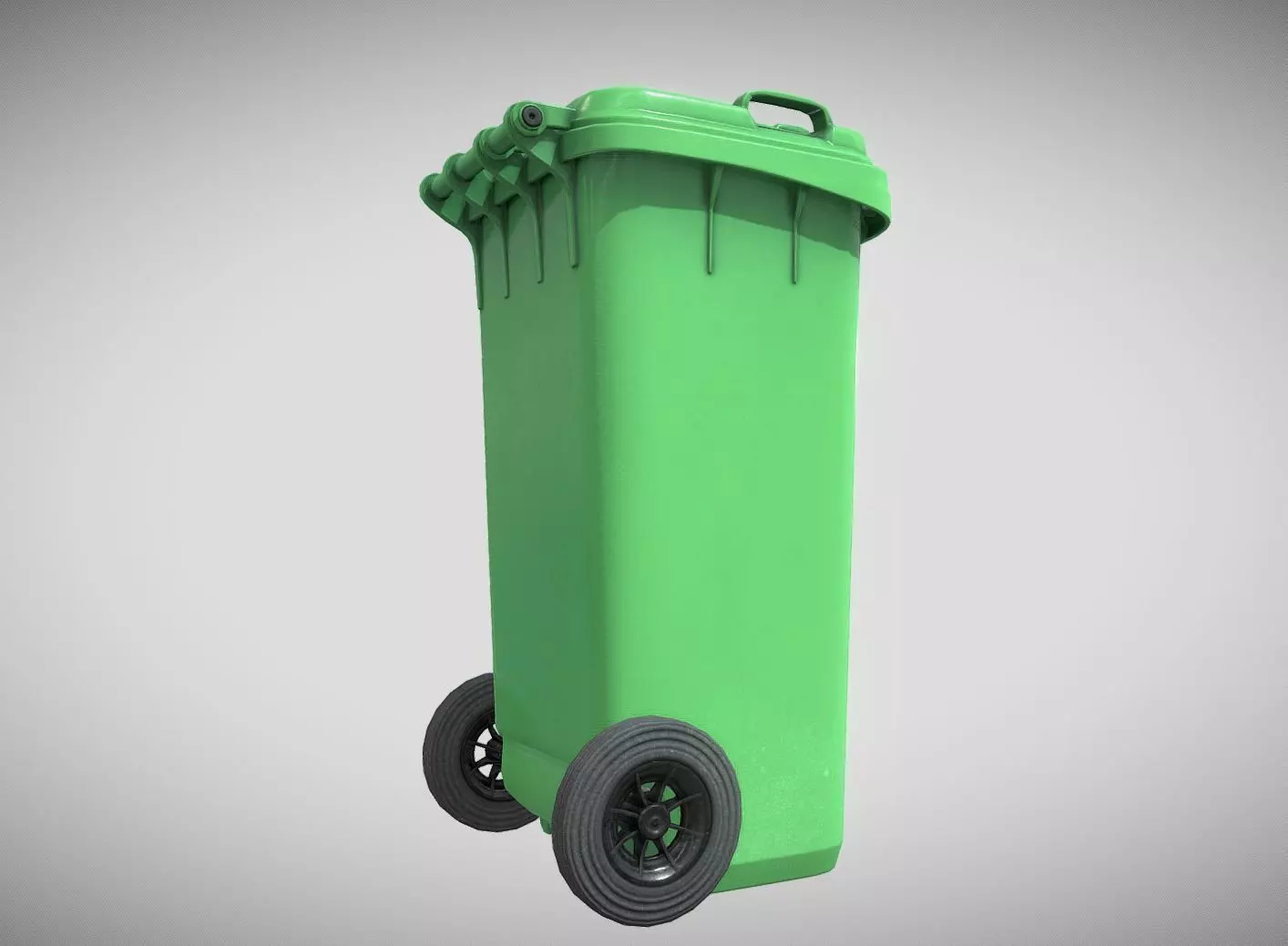 Here is the low-poly and game-ready version of the plastic waste bin in green with a filling capacity of 120 liters.