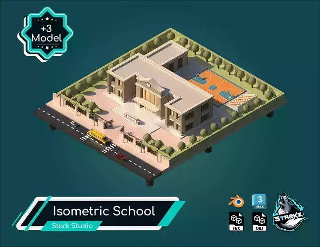 This 3D model features an isometric school with a large courtyard and playground. The school has an isometric design, giving it a 2D appearance with cartoon-like characteristics. The model includes three low-poly space car models created using 3ds Max software. Additionally, these models have been textured using Substance Painter to enhance the details and give them a more realistic look and feel. The available file formats for this model include Max 2023, Max 2022, Max 2021, Max 2020, Blender, FBX, and OBJ. With its intricate details and unique cartoon design, this 3D model is suitable for various projects, including video games, animations, and sculptures.