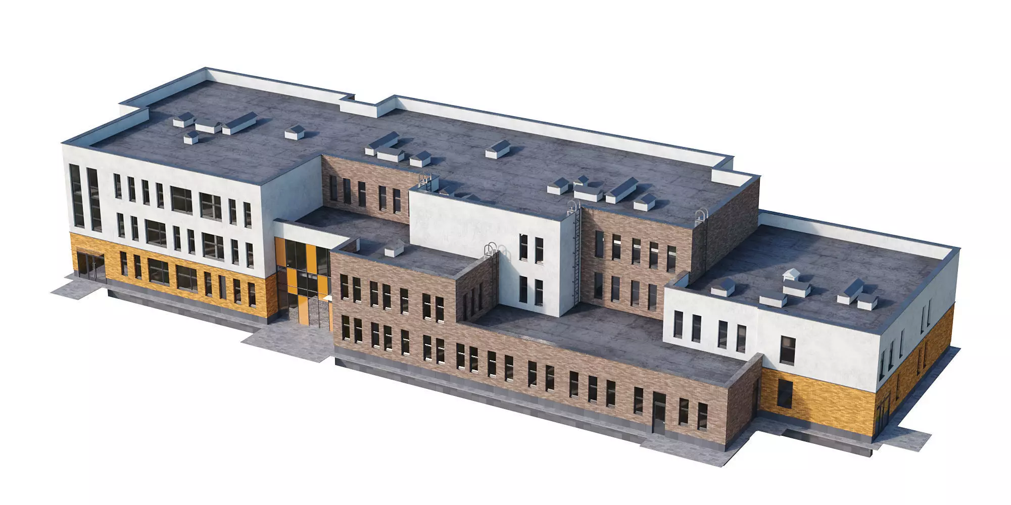 A high-quality model of a modern kindergarten/school building for visualization, featuring a small base for easy placement on the terrain. The model is assembled with maximum detail and precision, at actual dimensions, without the use of any plugins. The mapping stacks are not collapsed, allowing for easy editing as needed.Dimensions of building: length 70,4 meters, width 26,1 meters, height 11,6 meters. Dimensions can be adjusted