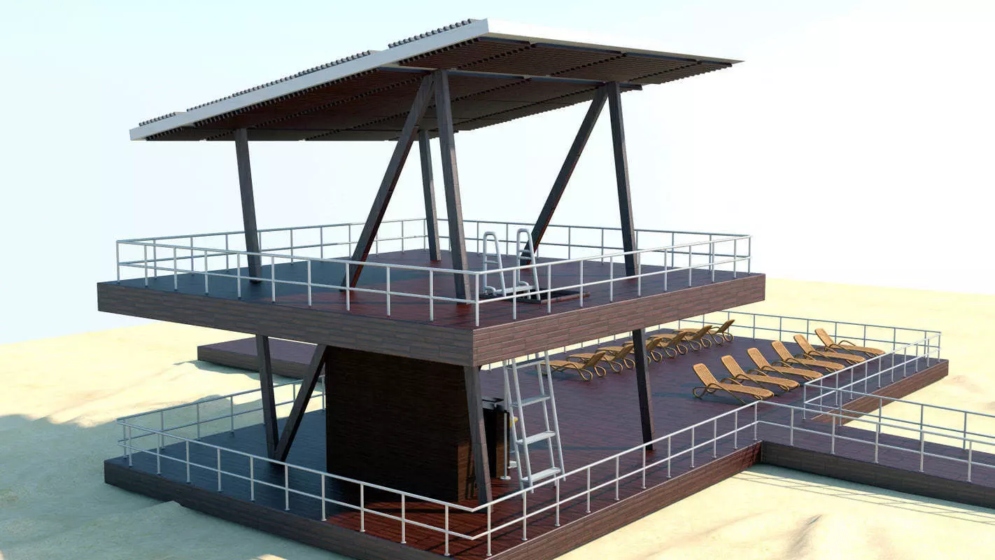 Lifeguard tower and wooden platform with bar.