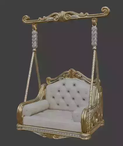This beautiful swing chair is made in shiny gold with fancy carvings and sparkling details. It has a soft, tufted cream velvet seat that looks very comfortable, with big rolled pillows on the sides. Thick twisted ropes hang it from an elegant gold frame. Perfect for luxury rooms, fancy hotels, or special home decorations. Great for realistic 3D renders and high-quality projects. The model has detailed textures and works well in any 3D software.