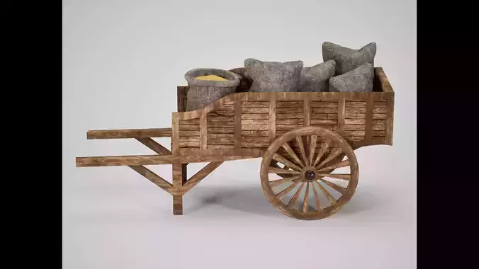 High-quality wooden handcart loaded with heavy burlap sacks, optimized for games, real-time applications, and medieval trade scenes.