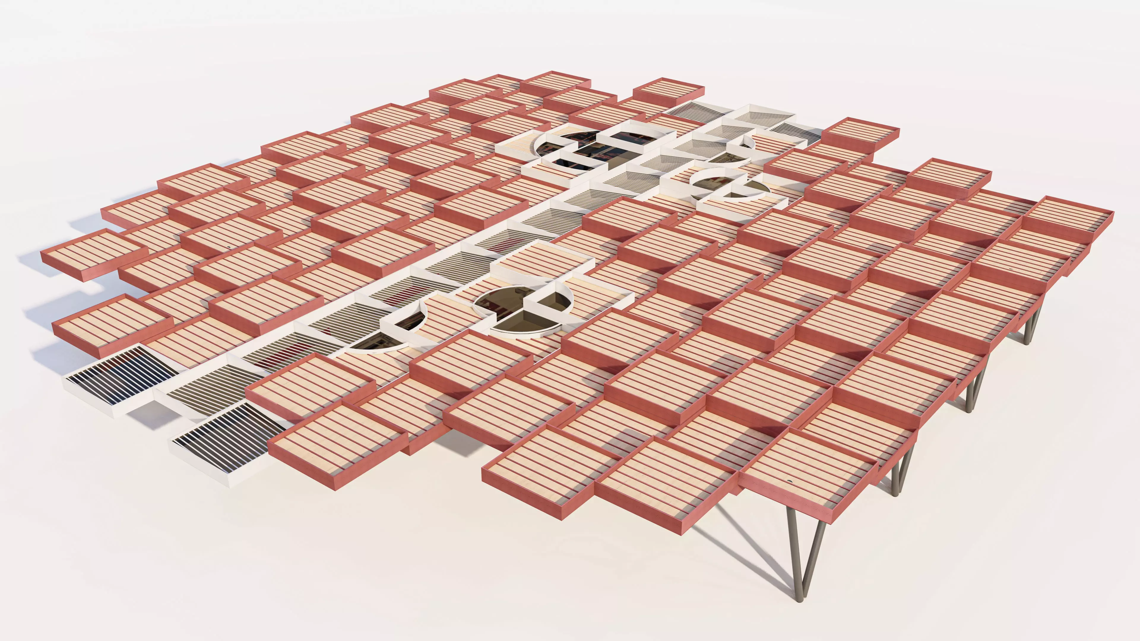 Aesthetic Wood Inlay/Louvres: The underside or side detailing features warm timber slats or beams, softening the structure and adding an Organic Modern feel.