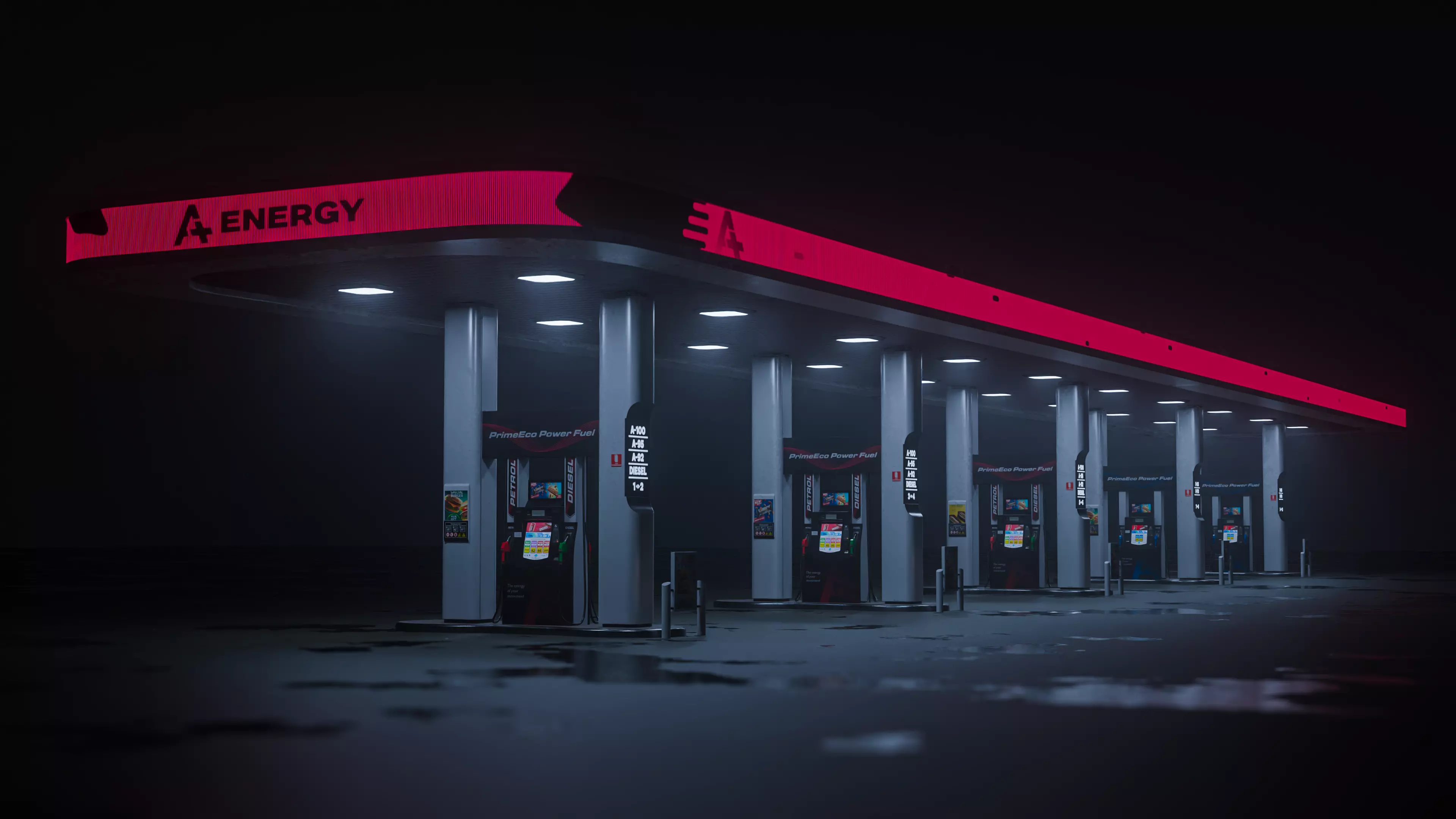 Highly detailed 3d model of the modern multi-fuel gas station. This asset has been meticulously crafted with exceptional attention to detail, showcasing a futuristic design and versatile functionality tailored to meet both current and future energy infrastructure needs. The station is engineered to support a diverse range of fuels: traditional gasoline and environmentally friendly hydrogen. This universal capability makes the model highly relevant for a wide array of projects focused on present-day transportation and emerging energy technologies.