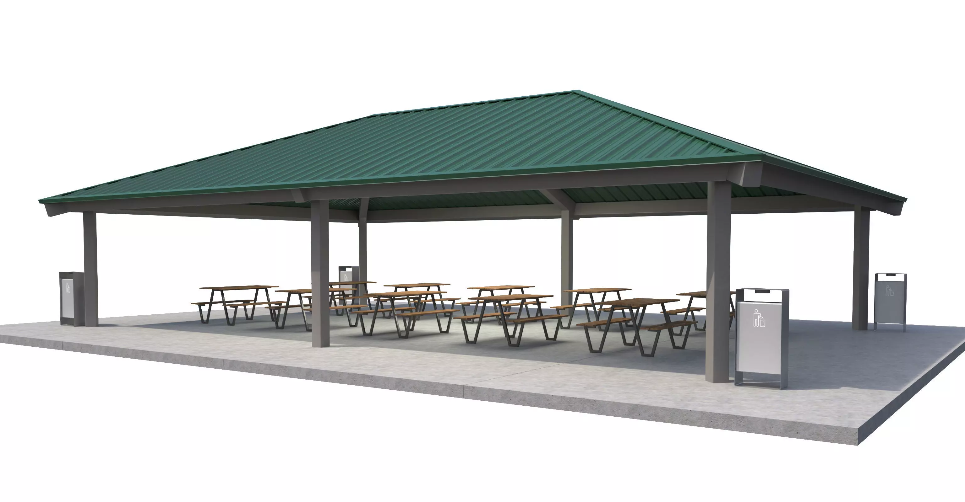 3D Model of a Public Building, a Park Pavilion with park Picnic Benches and Trash cans.