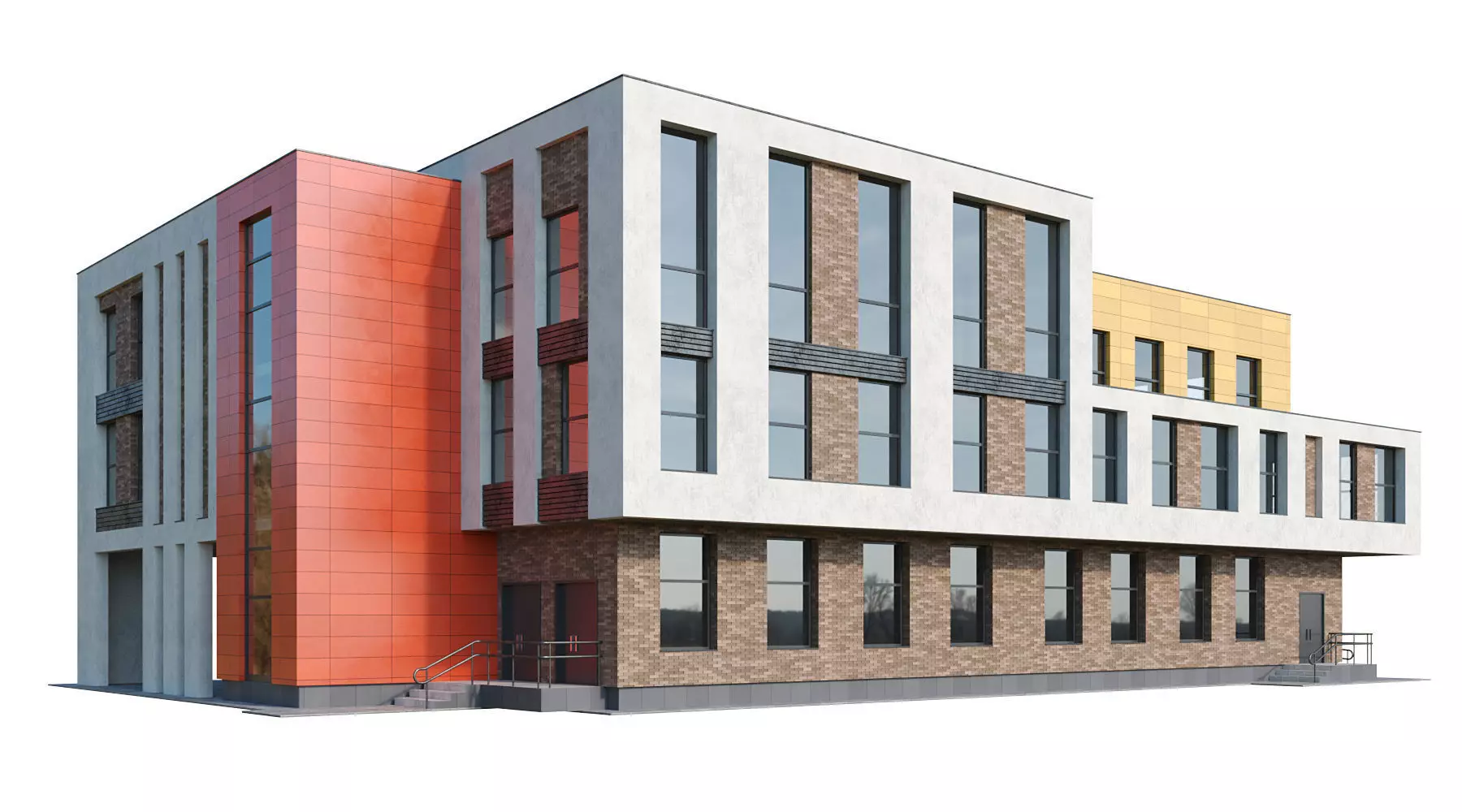 A high-quality model of a public building of kindergarden, small school, office or campus for visualization with a small base for easy placement on the terrain. The model is assembled with maximum detail and precision at real-world dimensions, without the use of any plugins. The mapping stacks are not collapsed, allowing for easy editing as needed.Dimensions of building: length 35.7 meters, width 22.5 meters, height 14.8 meters. Dimensions can be adjusted