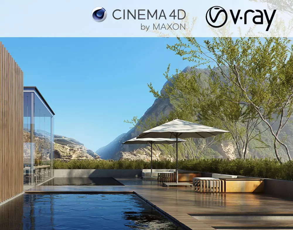 VRayforC4D Scene files - Resort Restaurant & Pool Exterior (Exterior CGI)
