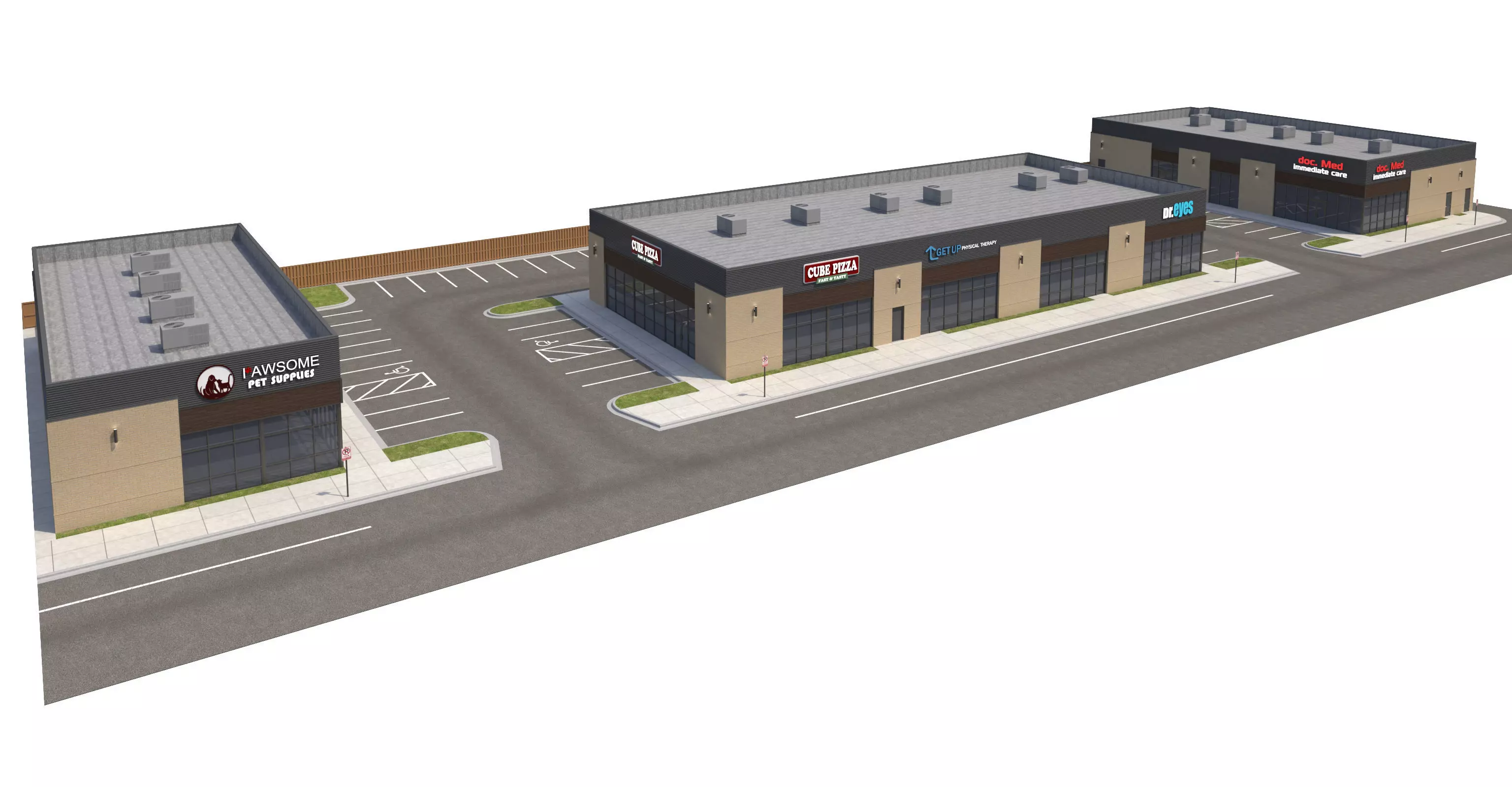 -3D model of a strip mall/outdoor Mall with tenants as shown in renderings
