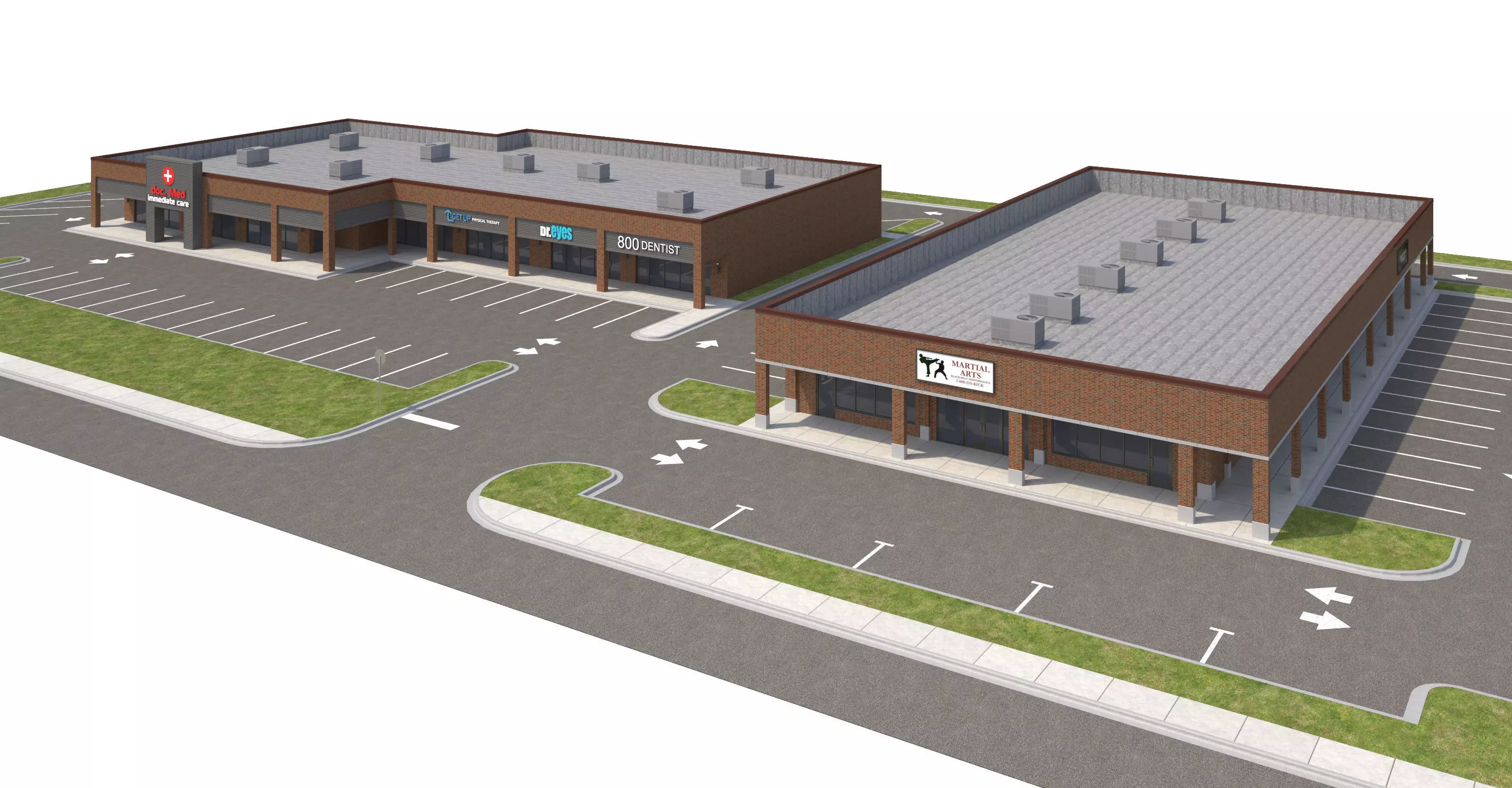 -3D model of a strip mall/outdoor Mall with tenants as shown in renderings-Interior Included, Interior Includes: Acoustical Ceiling tile and Light Fixtures, as well as interior walls and demising wall between tenants.