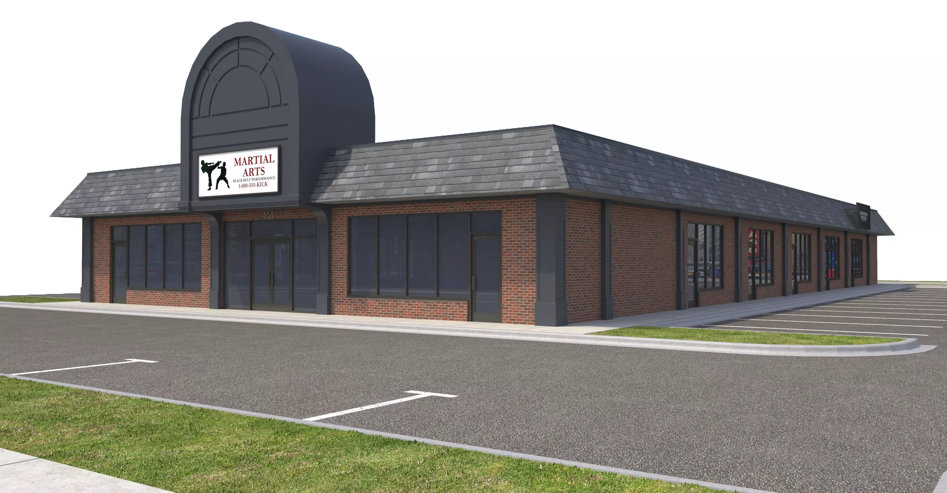 -Signage included-Roof Top Mechanical Units Included-Address on window or wall included-Light Fixtures Included-Sidewalks, grass, curbs, road, parking lot striping and road markings included-Grass has a subdivision on it to show the 3d grass.-Model objects all grouped into groups for easy scene movement per building, 1 group for site, 1 group for building.-Modeled in 3ds Max, Rendered using Vray and HDRI sky. HDRI map NOT included.-All textures included in Zip File, textures may need to be relinked.-Site is modeled so it can be expanded on with other buildings, this will be part of a set of other street buildings.