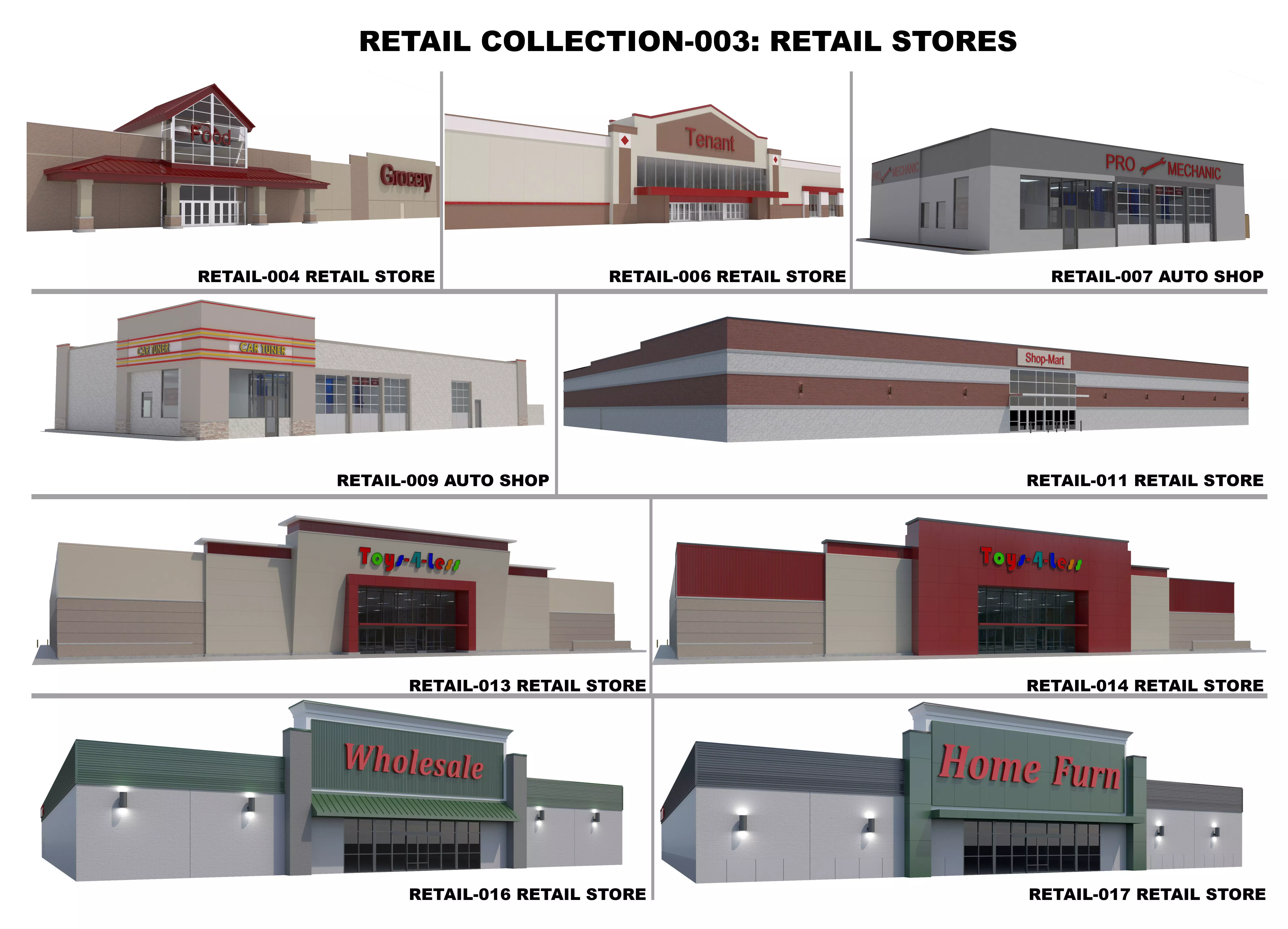 A Collection of 9 3D Exterior Only Models of Retail Stores (Mechanic Shops have interior)Large Discount for purchasing CollectionStores Include:-Retail-004 Grocery Store or other-Retail-006 Grocery, Furniture Or other type of Store-Retail-007 Auto Shop-Retail-009 Auto Shop-Retail-011 Grocery, Electronics, Furniture or Other Store-Retail-013 Toy Store, Grocery, Electronics, or Other Store-Retail-014 Toy Store, Grocery, Electronics, or Other Store-Retail-016 Toy Store, Grocery, Electronics, Furniture or Other Store-Retail-017 Toy Store, Grocery, Electronics, Furniture or Other Store