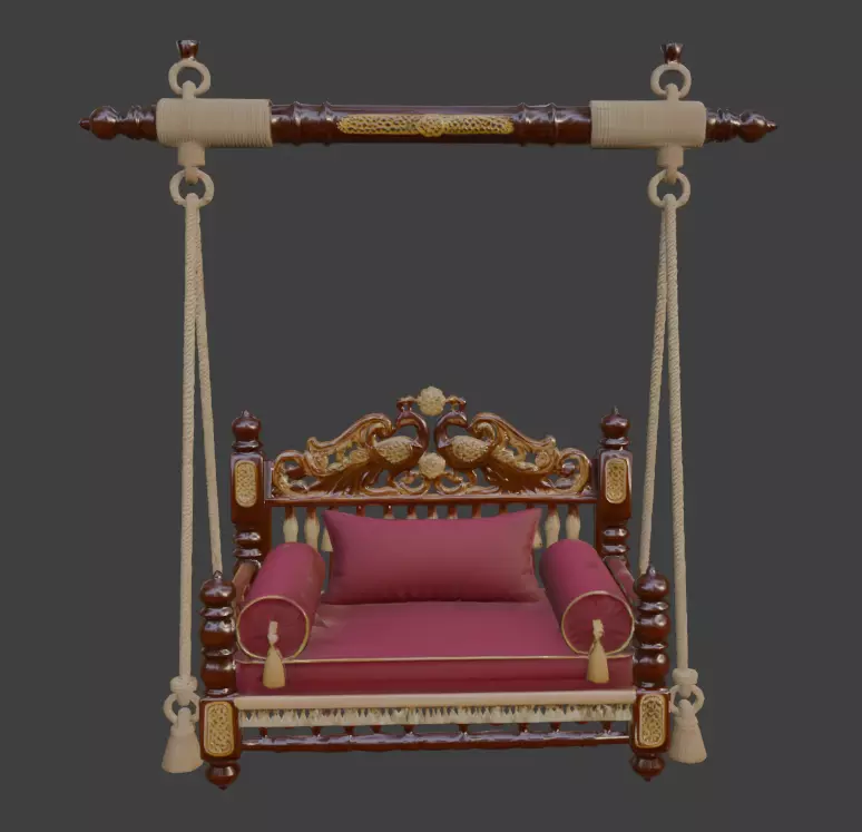 Elevate your interior with this exquisite traditional Indian wooden swing (jhula), meticulously crafted in a rich teak-inspired finish with intricate carvings and royal detailing. Perfect for living rooms, patios, or luxury home decor, this ornate swing features a beautifully sculpted frame with turned pillars, decorative finials, and a plush cushioned seat adorned with elegant patterned fabric and bolsters. The timeless design captures the essence of Indian palace architecture, making it an eye-catching statement piece for any sophisticated space. Ideal for photography, architectural visualization, or high-end residential projects. High-poly 3D model with detailed textures, ready for rendering in any professional software.