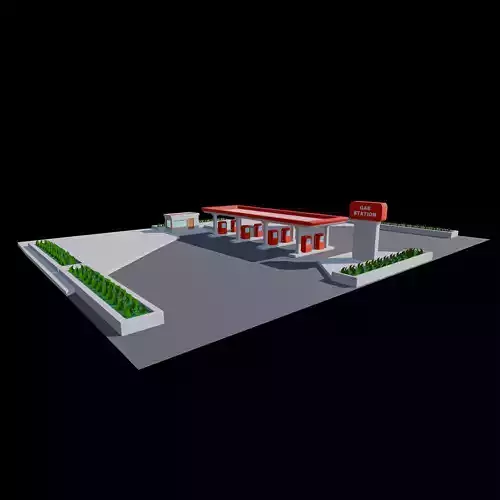 This 3D model represents a complete stylized gas station environment, including a main fueling canopy, multiple fuel pumps, a gas station sign, surrounding pavement, and landscaped planter areas. The design uses clean, simplified shapes with a modern, low-stylized aesthetic, making it suitable for games, animations, architectural previews, and scene prototyping.The layout is well-organized and optimized, with clear separation between structural elements and props. The model features clean topology, non-overlapping UV maps, and high-quality 4K PBR textures to ensure consistent visual quality in both real-time and offline rendering workflows.