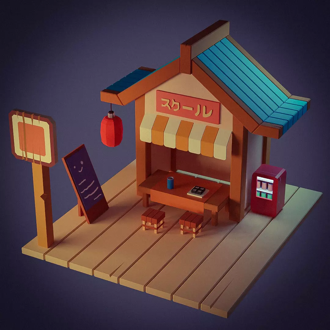 Here comes a cute lowpoly sushi shop model, visitors come by and eat dinner with asian friends! model is simply colored and decorated with a mix of culture and modern brands.