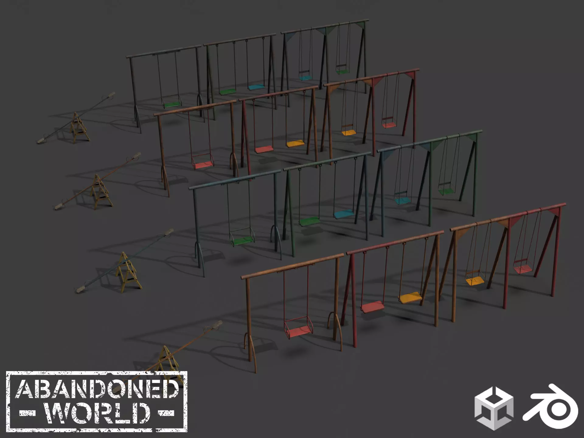 A set of objects for creating scenes with old playgrounds in the post-Soviet style. The set contains models for arranging swings on the playground. There are 4 coloring options in the set: blue-green, red-orange and the same colors in a more rusty version.