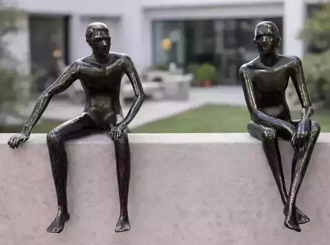 This high-quality stylized human sculpture 3D model set features two seated abstract human figures, designed with elegant proportions and a modern artistic feel. The models depict realistic sitting poses, ideal for architectural visualization, public art concepts, gardens, courtyards, galleries, and decorative scenes.