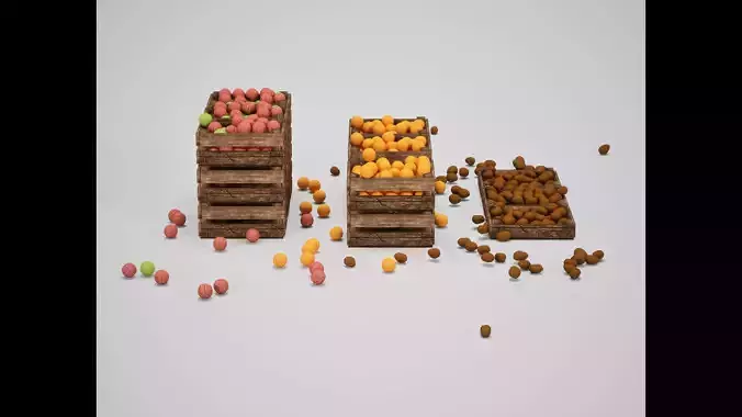 This asset features sturdy wooden crates loaded with colorful produce (apples and oranges). Designed to add vibrancy and life to market stalls, kitchen cellars, or cargo piles, these crates provide an essential narrative element for any environment involving trade or food.