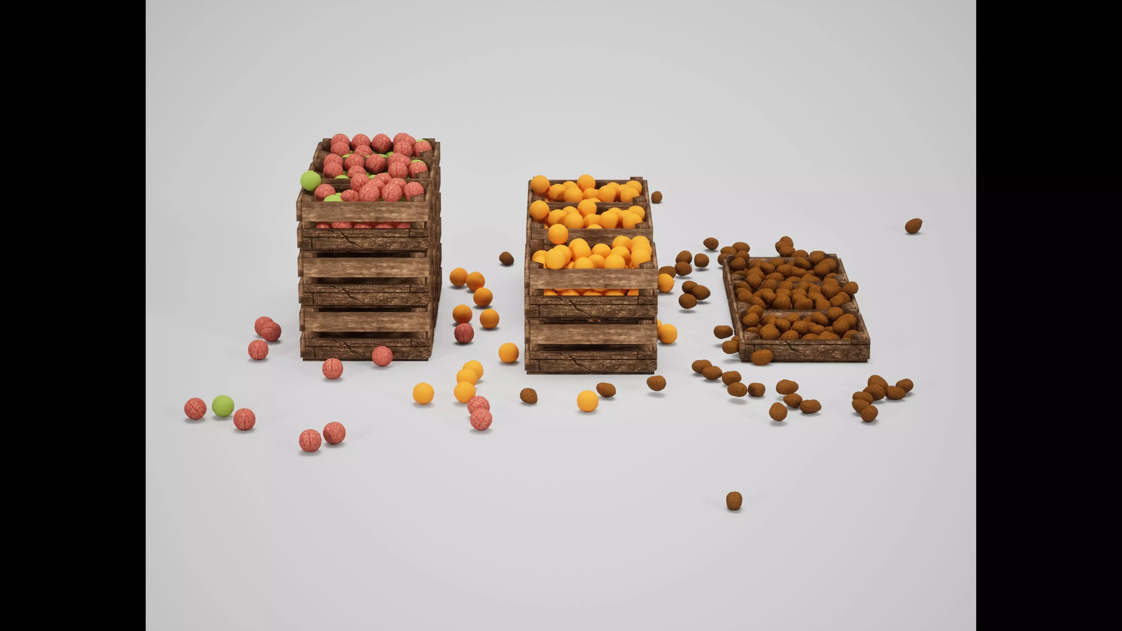 High-quality set of wooden crates filled with fresh fruit, optimized for games, real-time applications, and medieval market scenes.