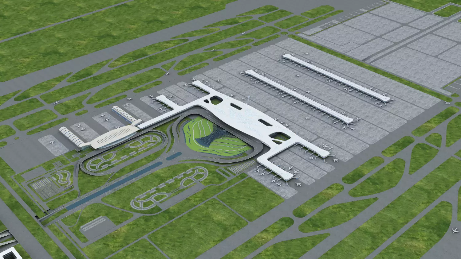 The model includes:Terminal Complex: The flagship T3 terminal with its signature undulating roof, large skylights, and the central “green valley” atrium. The terminal is connected to multiple concourses with jet bridges, and the adjacent T2 terminal is also included for full context.Airfield Infrastructure: Multiple runways, a sprawling apron with over 100 aircraft parking stands, taxiways, and a control tower.Ground Transportation: Multi-level parking garages, access roads, and the integrated transportation hub connecting the airport to the city’s metro and high-speed rail network.