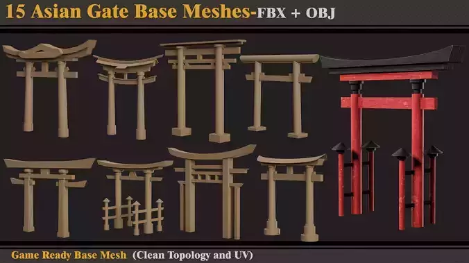 Hello ;)This product contains 15 Asian gate base meshes.In each file, there are: