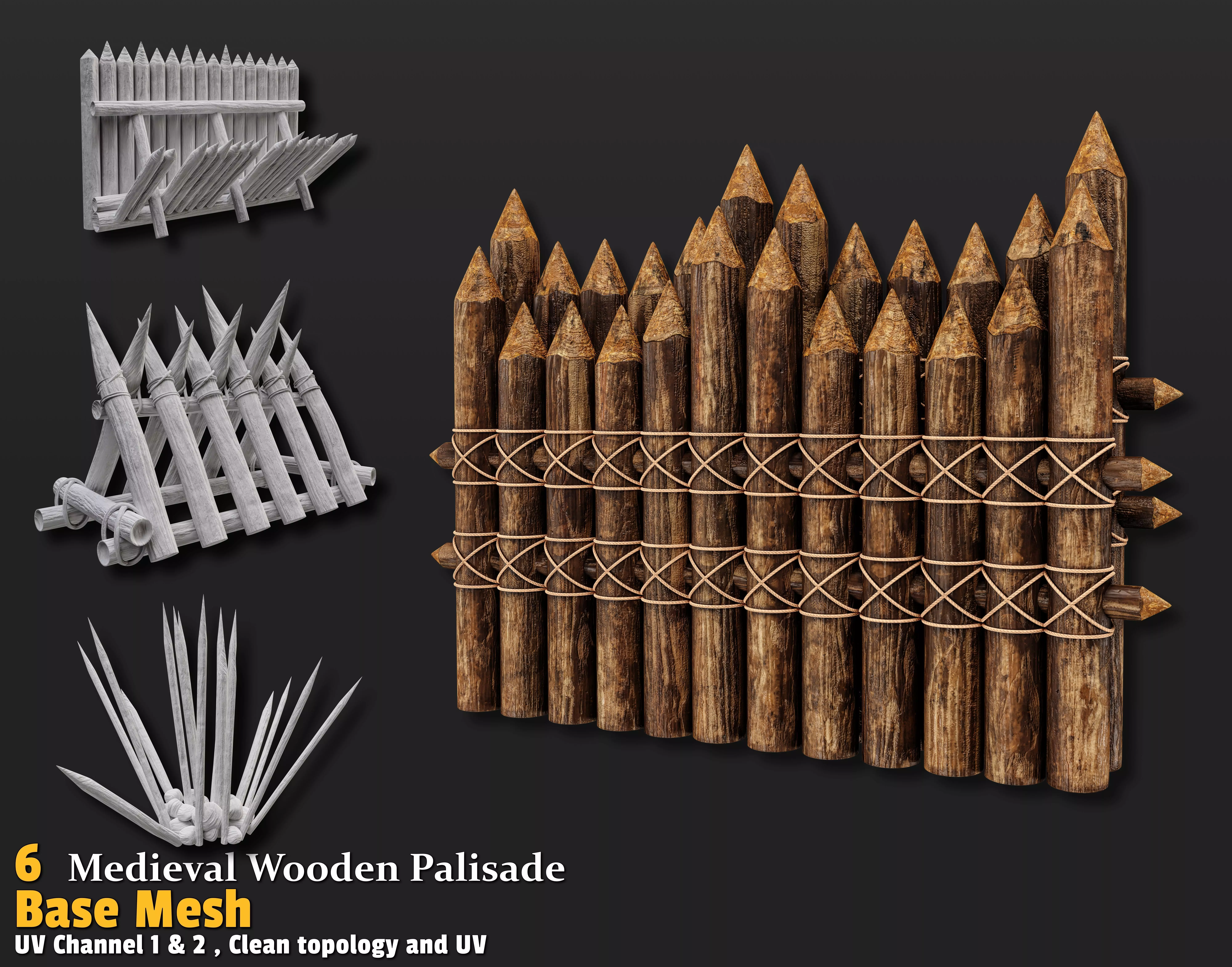 This game-ready pack features 6 unique medieval wooden palisade models with handcrafted designs and 4K textures, bringing castles, villages, and adventure camps to life. Each model showcases authentic wood and rope details, ready for action!
