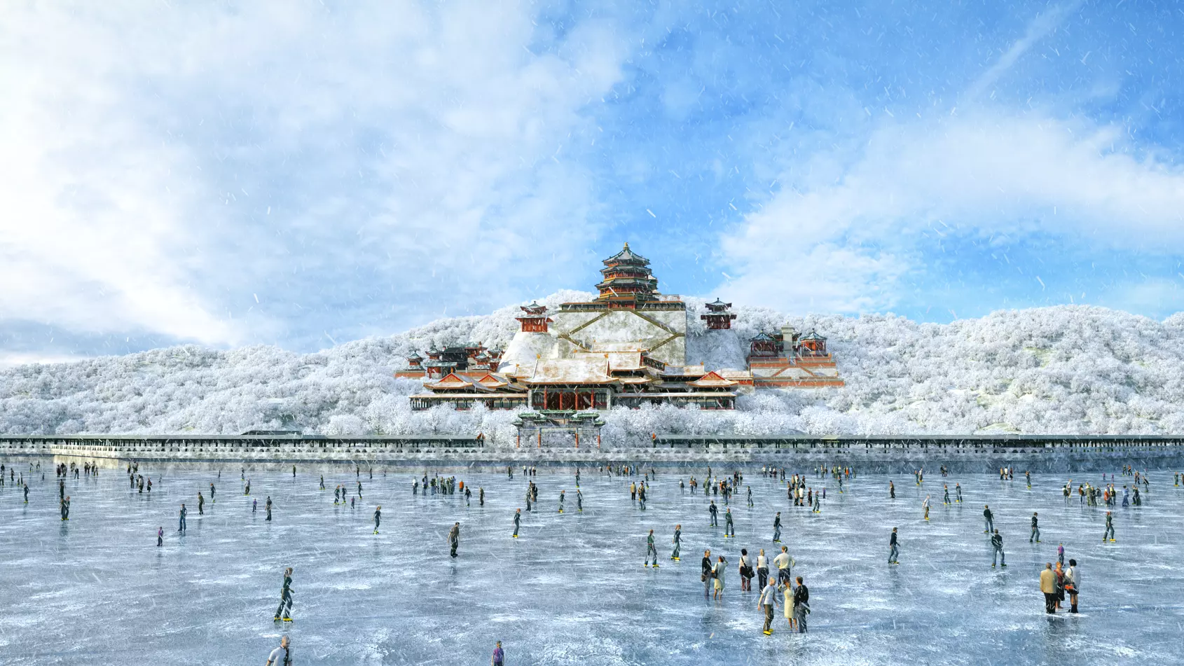 Frozen Kunming Lake: The expansive frozen lake transformed into a winter ice rink, with dynamic animated characters.