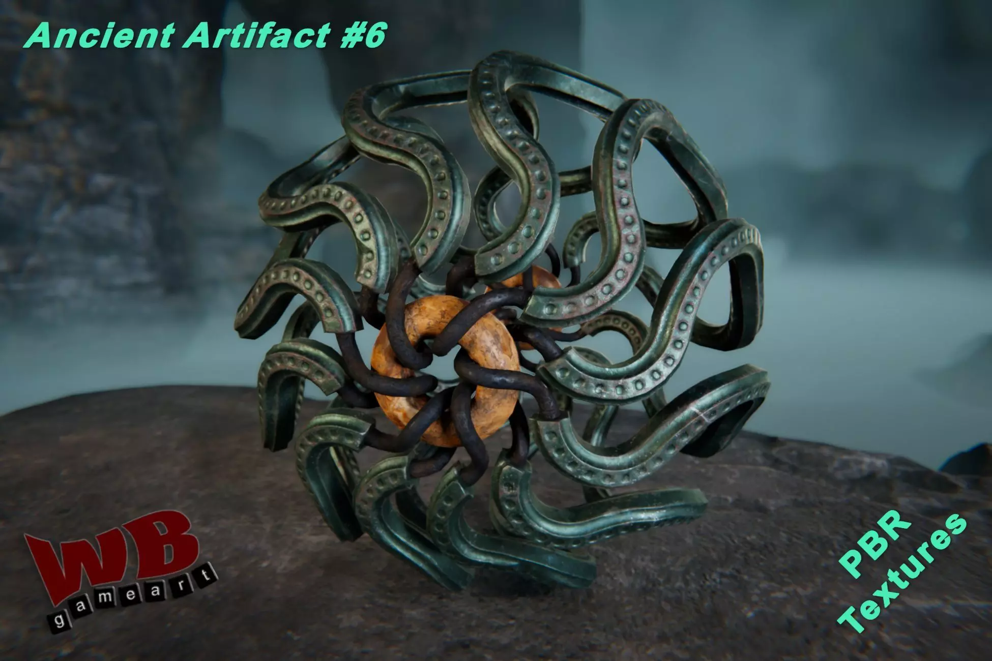 This intricate artifact consists of a twisting cage of oxidized green metal bands, each adorned with detailed embossing that evokes forgotten craftsmanship or arcane machinery. At its core, smooth toroidal forms carved from warm-toned marble are interlinked with dark, aged metal tendrils - creating a mysterious structure suggestive of containment or energy convergence. The elaborate geometry, weathered materials, and high-detail surfacing make this asset a captivating visual centerpiece for temples, cosmic vaults, or alien ruins.