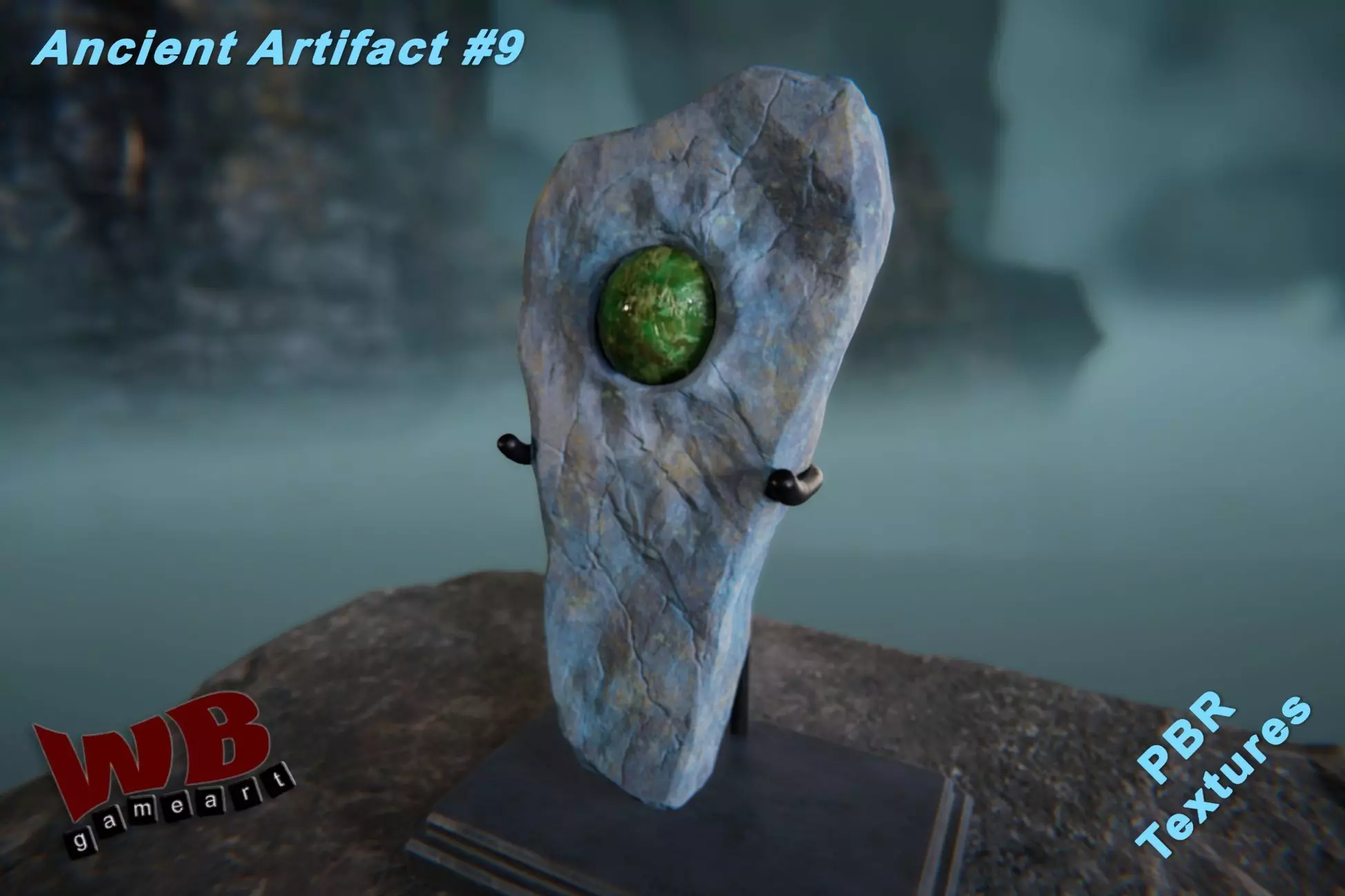 Carved from rugged, weathered rock, this enigmatic relic holds a polished green gem embedded deep within its surface - evoking forgotten civilizations and arcane energies. The natural mineral contrasts beautifully with the smooth, luminous orb, making it ideal for magical altars, ancient ruins, or esoteric devices. High-resolution textures and refined sculpting allow it to perform exceptionally well in detailed close-ups.