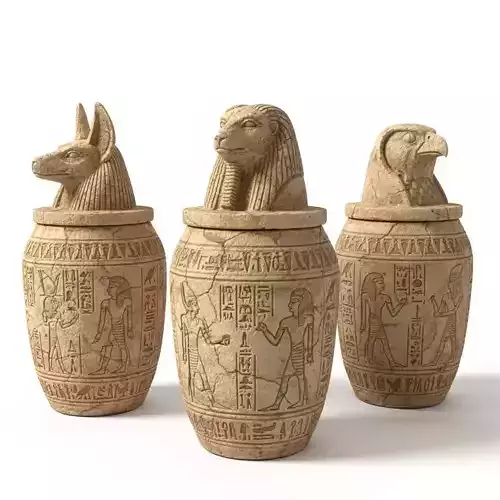 This premium 3D asset collection features high-quality Ancient Egyptian Canopic Jars, representing the sacred funerary vessels used to store and protect internal organs during the mummification process.
