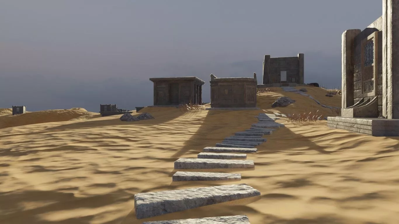 The scene is populated with stone ruins, sandy hillside, stone pathways, small ancient structures - details like weathered stone walls, partially buried paths, scattered building remains add authenticity and depth. Ideal for teams building historical games, educators creating 3D period content, or AI pipelines needing diverse cultural scene data.