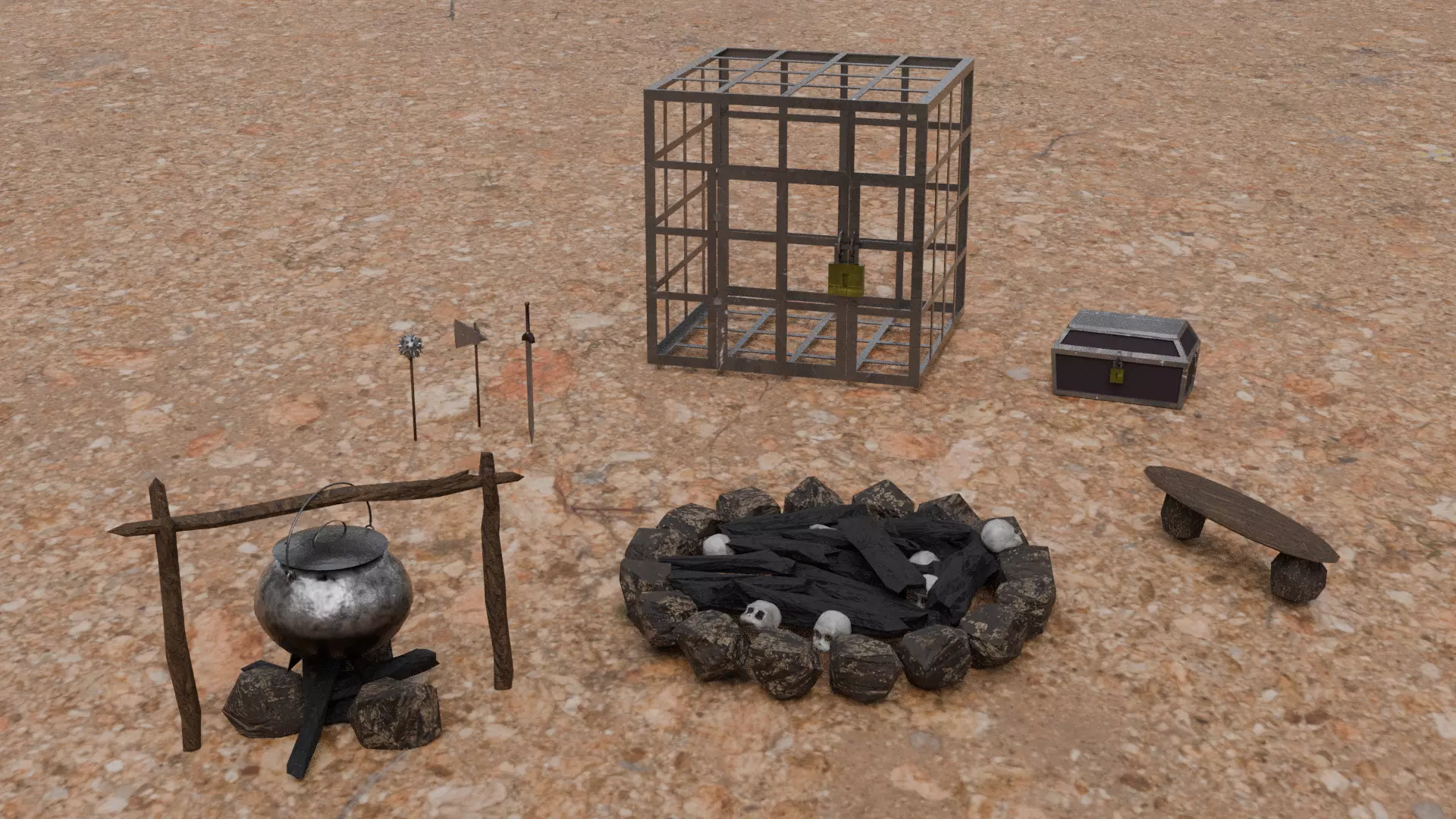Technical Note: Total Pack Polycount: ~20,000 Triangles (all items combined excluding extras).Average Per Asset: High-detail items (Mace/Skulls) are denser, while structural props (Cage/Bench) are highly optimized low-poly.