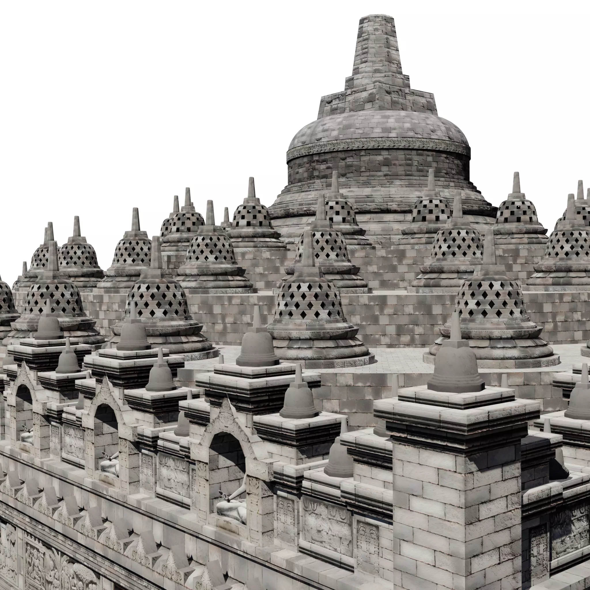 Borobudur, located on the island of Java in Indonesia, is one of the world's most impressive and largest Buddhist monuments. Built during the 8th and 9th centuries under the Syailendra dynasty, this UNESCO World Heritage site comprises a massive stone structure adorned with intricate relief panels and hundreds of Buddha statues. The monument is designed as a mandala, representing the Buddhist cosmology and path to enlightenment through its nine stacked platforms. Each level, adorned with detailed carvings depicting scenes from Buddhist scriptures and teachings, culminates in a central dome adorned with stupas, each containing a Buddha statue. Borobudur stands as a testament to ancient Java's rich cultural and religious heritage, attracting visitors from around the globe to marvel at its architectural grandeur and spiritual significance.