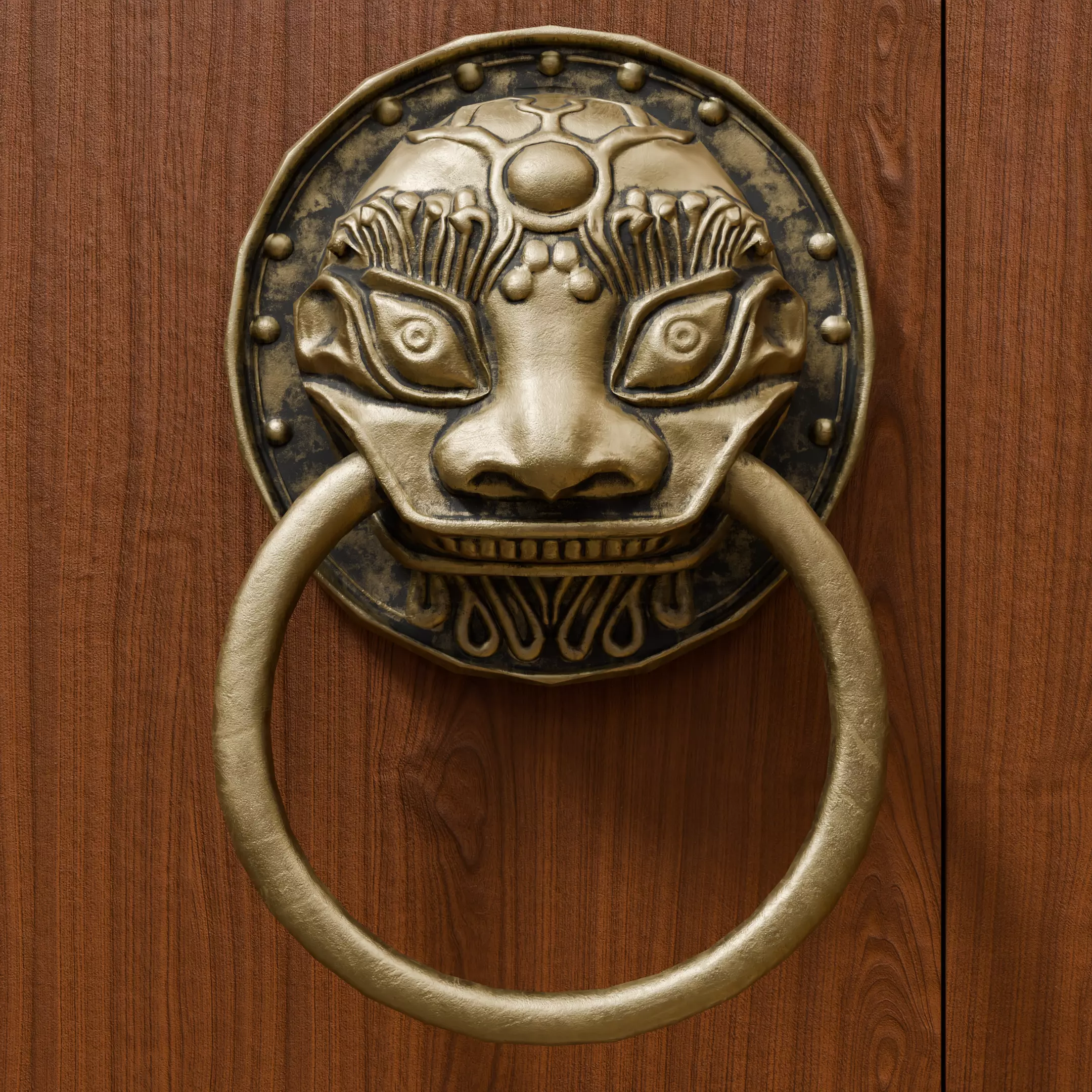 This is a meticulously crafted low - poly 3D model of a traditional Chinese beast head door knocker, created following the PBR (Physically Based Rendering) workflow. The model has 1,294 vertices and 1,308 faces, making it highly suitable for real - time applications where performance is a concern.It comes with five PBR texture maps:BaseColor.png: Defines the base color and overall appearance of the door knocker.Displacement.png: Adds fine - grained surface details and depth.Metallic.png: Controls the metallic properties, giving the door knocker a realistic brass - like metallic sheen.Normal.png: Enhances surface normals, creating the illusion of more complex geometry and subtle details.Roughness.png: Manages the roughness of the surface, determining how light interacts with and reflects off the door knocker.Application ScenariosGame Development: Perfect for use in ancient Chinese - themed games, whether it's a large - scale MMORPG with ancient cities or a small - scale indie game set in a traditional Chinese courtyard. It can be used to decorate doors in game scenes, adding an authentic touch to the environment.Architectural Visualization: Ideal for virtual tours or 3D visualizations of traditional Chinese architecture, such as ancient mansions, temples, or gardens. It helps in recreating the detailed and ornamental aspects of historical buildings.Film and Animation: Suitable for use in short films or animations with a Chinese cultural theme, where realistic and detailed props are needed to enhance the visual storytelling and cultural authenticity.About the Asset BundleThis model is part of a larger Chinese - style door knocker asset bundle that will include a total of 9 unique door knockers — 5 featuring beast head designs (like this one) and 4 with simpler, elegant traditional patterns. Stay tuned for the complete bundle, or collect these intricately designed door knockers individually as they release!