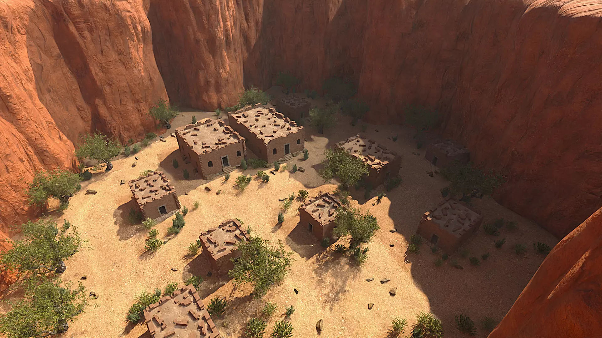 A ruined desert village set within a rocky canyon, featuring abandoned brick structures, sandy ground, scattered shrubs, and sparse trees - a realistic ancient ruins environment in clean natural light. The warm, sun-baked tones lend it a distinctly stark quality.