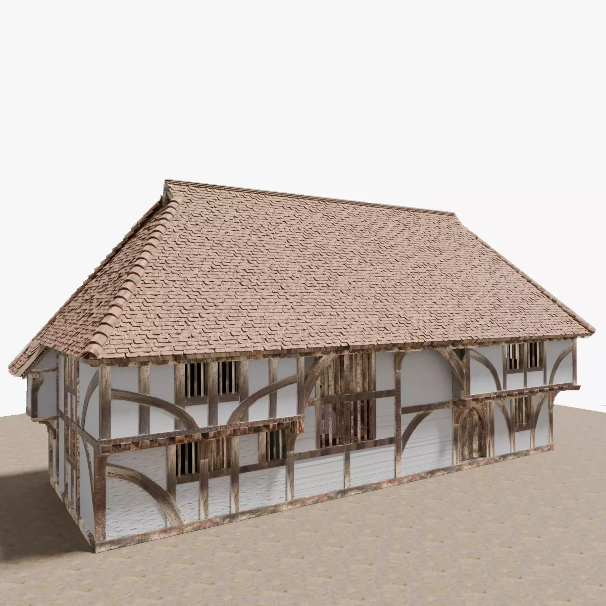 This is an existing medieval 15th century farmhouse in England. Accurately modeled from the following extant house.( https://www.wealddown.co.uk/buildings/bayleaf-farmstead-chiddingstone )The house was built in the period before fireplaces developed, with a hearth in the center of the house, so the central part of the house, where the smoke rises, is vaulted.The walls and roof are separate parts and can be hidden.