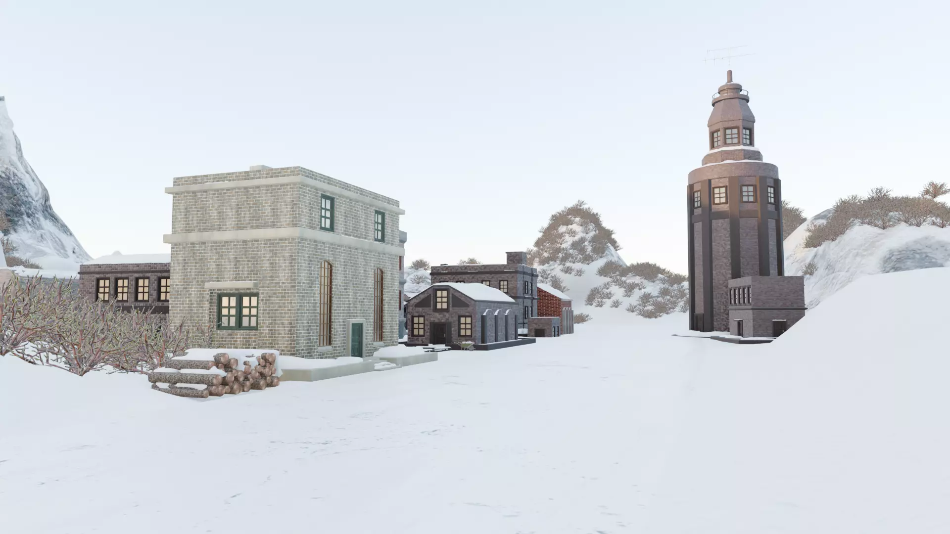 Notable assets include snowy village, mountains, brick buildings, complemented by fine touches: thick snow blanket, steep mountain walls, isolated settlement layout. Well-suited for historical game levels, heritage visualization projects, and synthetic AI datasets covering pre-modern environments.