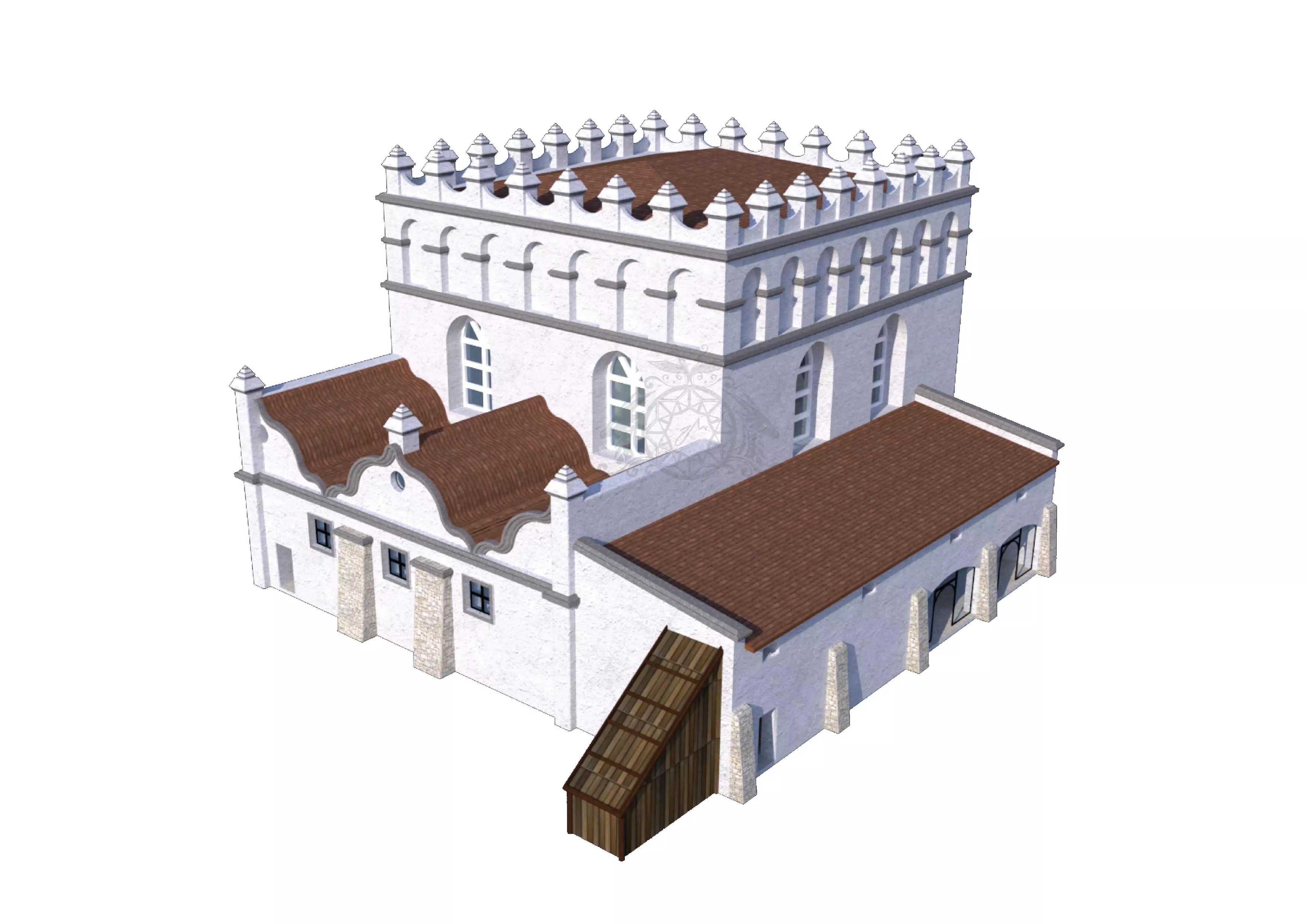 This 3D model represents a possible real-life reconstruction of a historic Orthodox Jewish synagogue, the 16th-century Golden Rose/Turei Zahav Synagogue of Lviv (Ukraine). It's commonly characterized by solid masonry walls, arched windows, pointed vaults, and a fortress-looking upper volume adorned with merlon-embrasure features. The exterior showcases white plastered thick stone walls and ornamental roofline details.