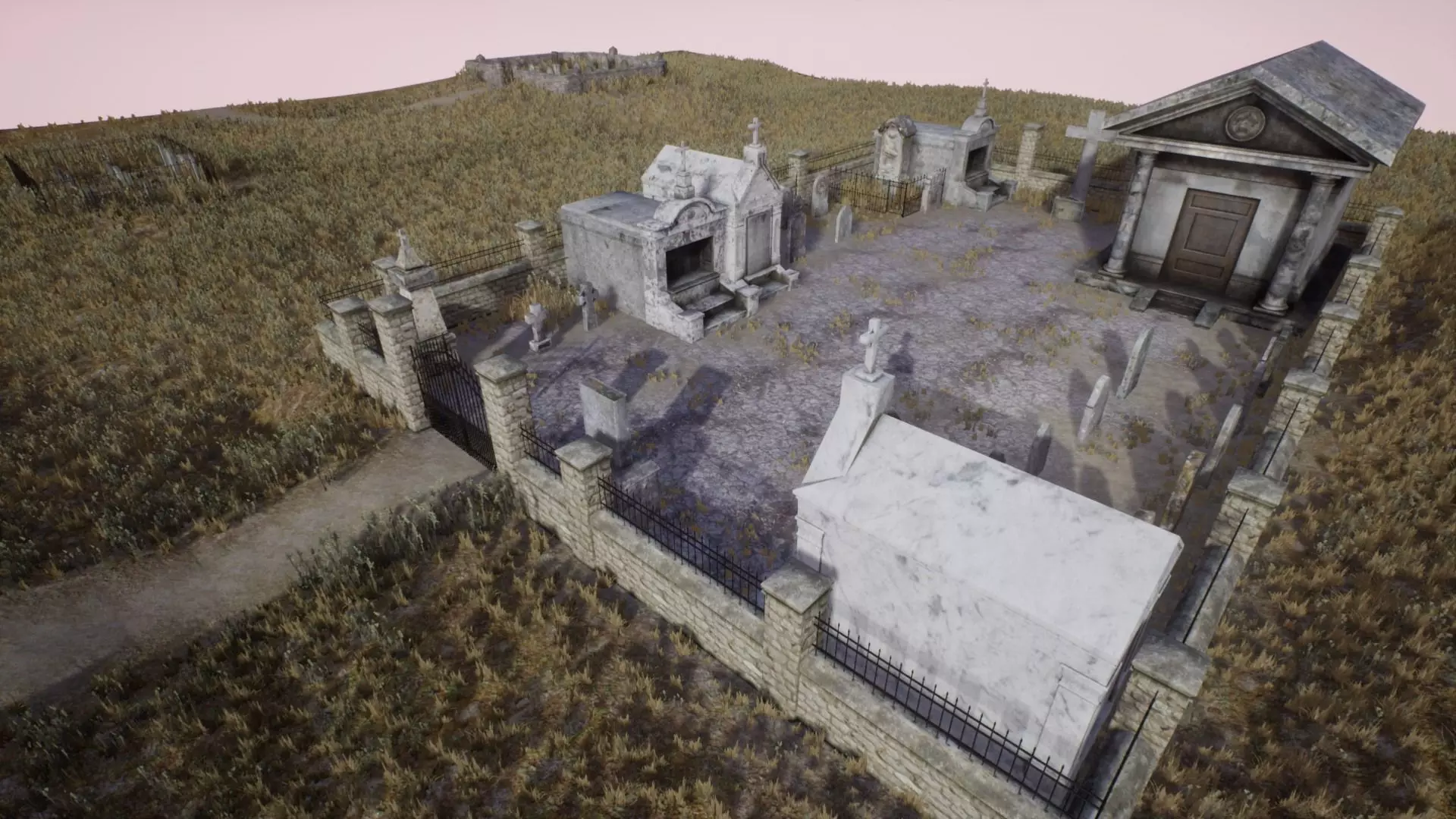 -Also includes free terrain textures and grass for the scene. Examples decals for the cemetery wall included.