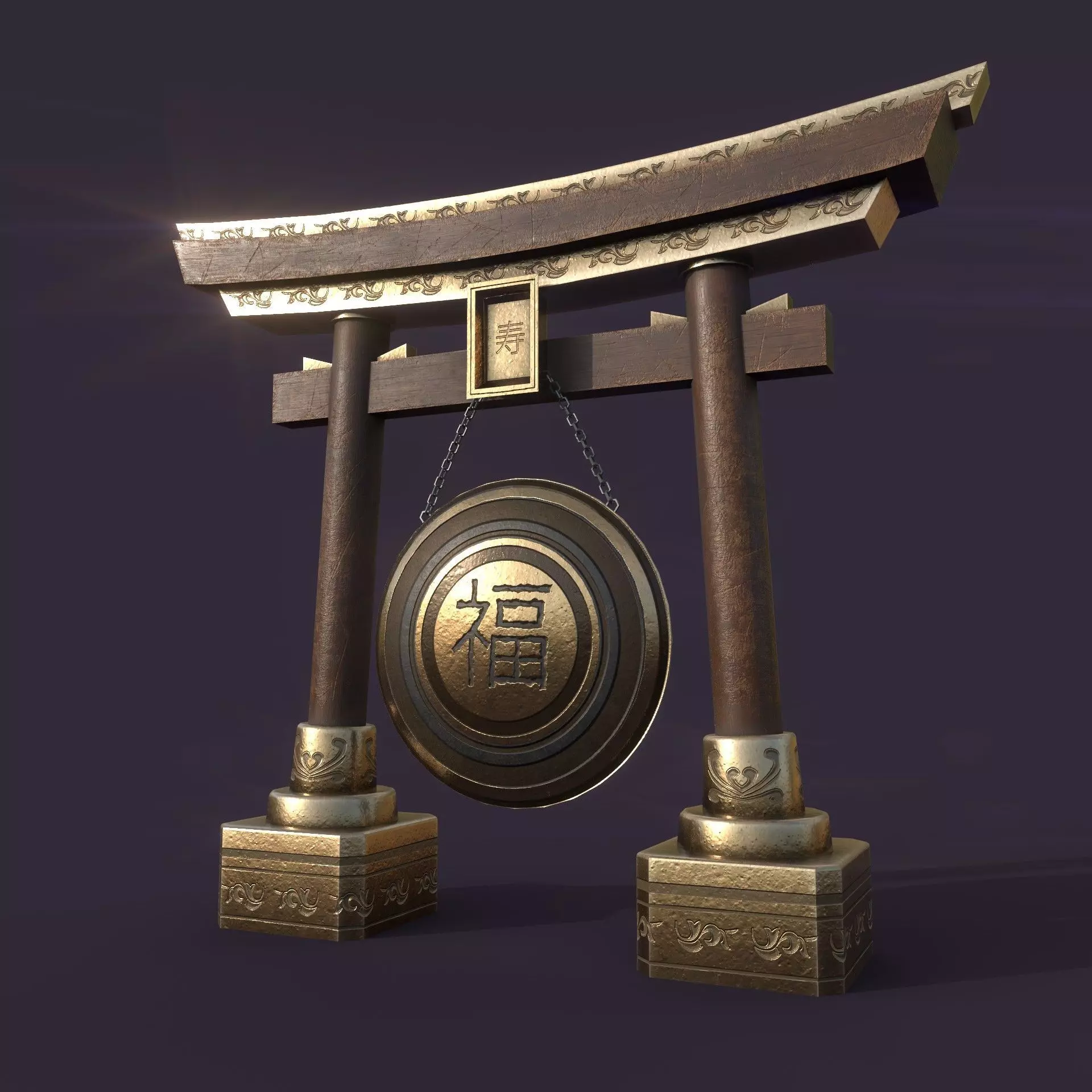This elegant 3D model features a traditional Japanese torii gate structure with a hanging gong. The torii has rich wood textures and gold accents, while the gong is inscribed with the kanji symbol “福” (meaning “good fortune” or “happiness”) and the smaller kanji “寿” (meaning “longevity”) above.One single 4k texture, mesh triangulated