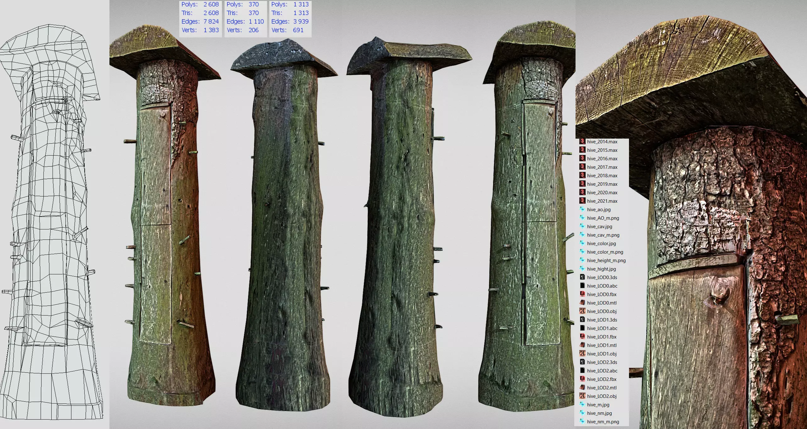 a photogrammetry model of a bee house with manual retopo and lod levels. PBR 4k textures included. A honey bee house made from a tree trunk. Its an old school way of making beehives found and scanned in Lithuanian open air Folk Museum. 3D scanning of object produces authentic and realistic textures and manual retopo ensures low poly model with good detail representation. The door of a bee-house is a separate object and can be opened. The interior of bee house is not included. It could be used in any game engine. Textures for PBR are included but materials will have to be created in the engine you are using. Normal maps are tangent space, you might need to flip colors to make it work for your engine. For 3d max files - 2021 version uses arnold and pbr material is used.