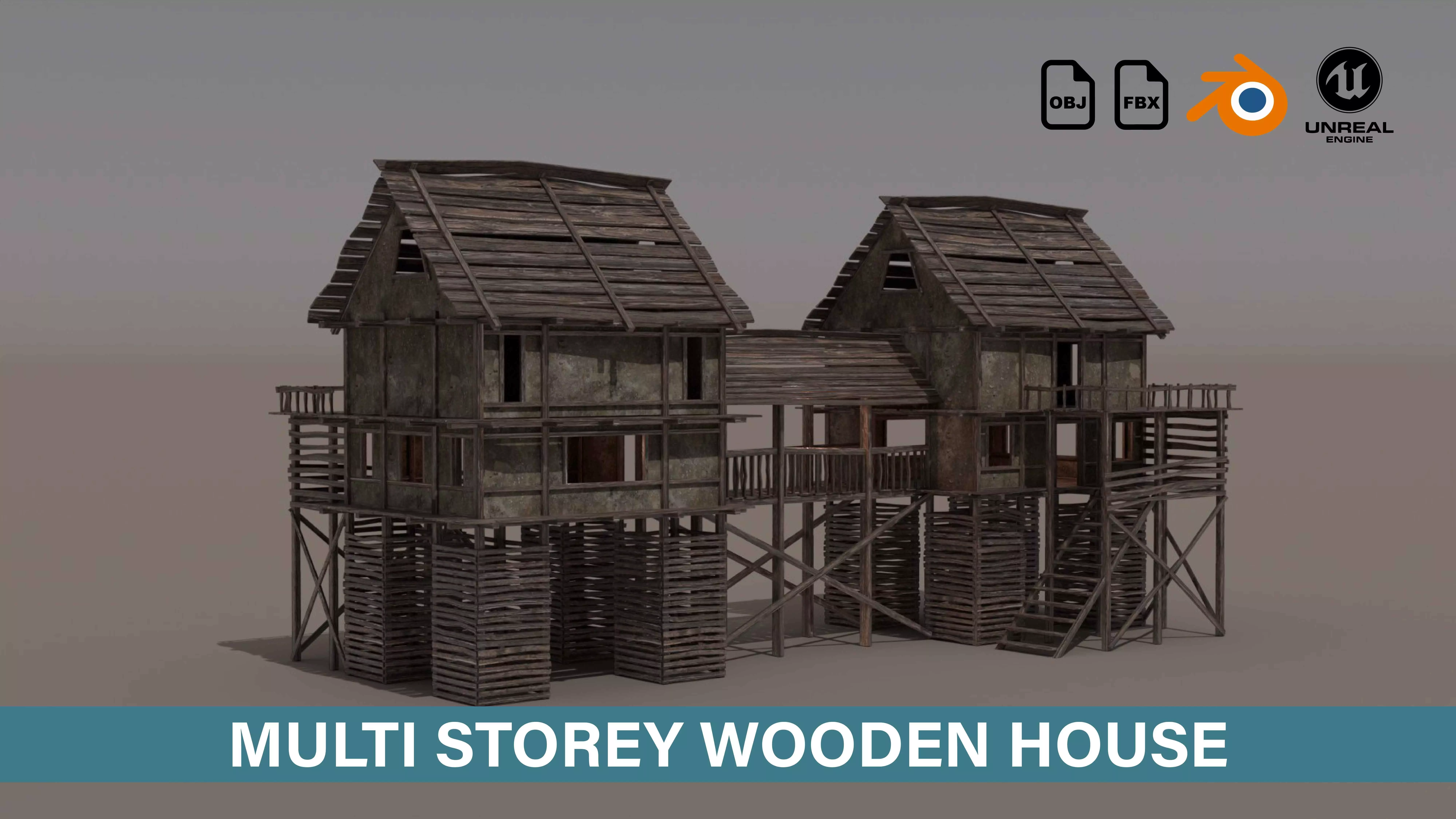 Low Poly Multi-Storey Wooden HouseThis 3D model presents a beautifully crafted multi-storey wooden house, designed in a low poly style to enhance performance without sacrificing charm. The house features multiple floors, detailed wooden textures, and rustic architectural elements, perfect for adding a cozy, natural feel to your environment. With its simple yet elegant design, the house comes complete with a customizable roof, balconies, windows, and doors, offering flexibility for different settings. This model is optimized for game development and real-time applications, ensuring smooth integration into any project.