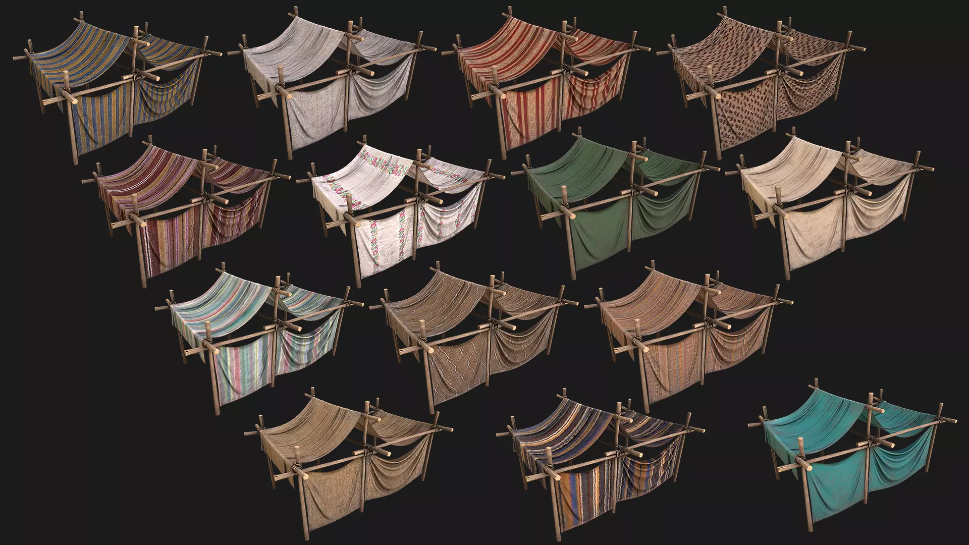 Game ready model. Market Stalls Pack fully textured, sculpted and rendered with Physical based rendering (PBR) - Shown images have been rendered in Marmoset Toolbag .The models contains lods, detailed information on the images.The model consists of two UV Maps :Tent(4096x4096).The set contains 14 color variations for the tent.