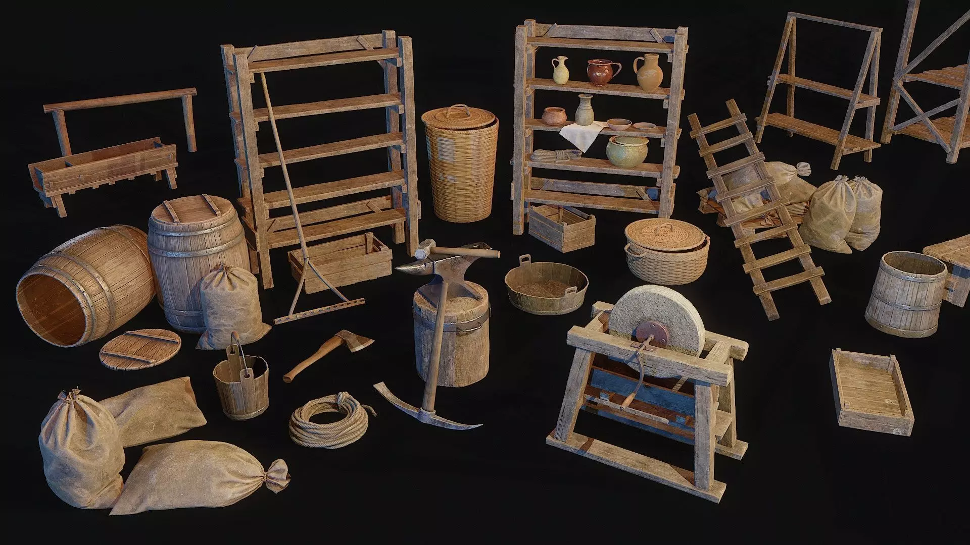 3D models of medieval farm ambiance include elements such as saws, fences, wooden furniture, hand tools, firewood, carts, kitchenware, and accessories for animal care. The collection features crates, axes, pickaxes, and hand saws, adding authenticity to the medieval farm lifestyle. These models are perfect for creating an atmospheric and realistic farm scene that reflects the daily life of the time.