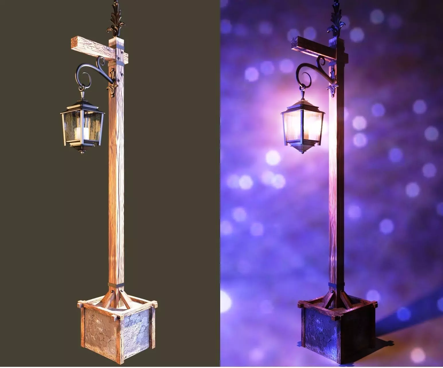 -This is a 3D render of a medieval wooden lamp post with three materials: wood, painted iron, and cement.