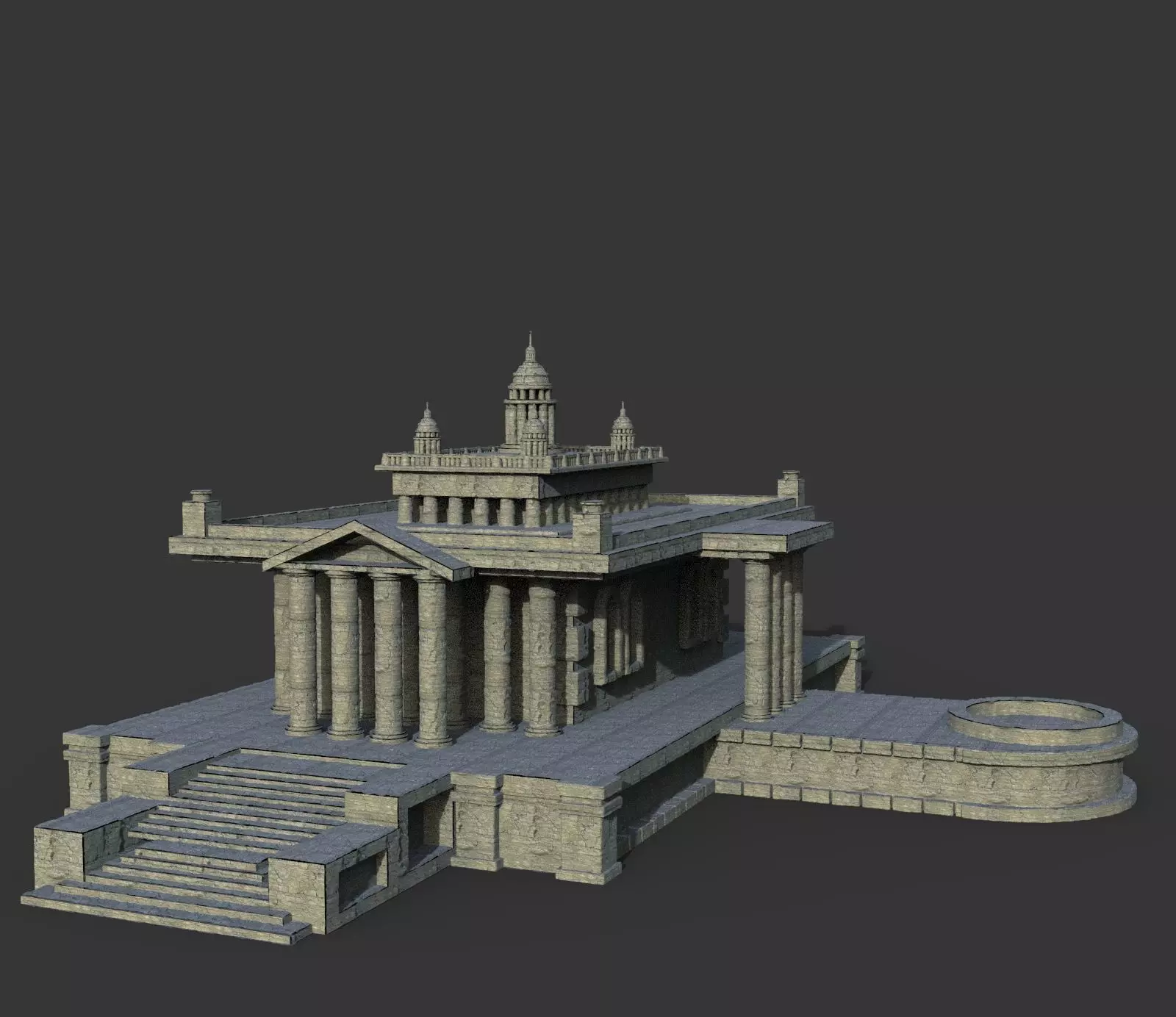 Old Temple modelTextures are also applied in keyshot if you want that too But if you want to apply your textures so you can apply it too Or contact me for textures Ready for a render just apply materials and add to your scene fie or you can contact me for textures or rendersRar archive contains:Just put it into your scene and render!.obj format:Rar archive contains two versions of the model:Exported without collapsing after the mesh is smooth. Low or med poly mesh which you can see in preview images, is good if you need to edit a model.Exported after applying mesh smooth. Just import, apply materials and renderSimple materials, textures may have to be added manually..fbx Rar archive contains model exported after applying mesh smooth. Just import, apply materials and render.Simple materials, textures may have to be added manually.Polycount are here Polygons : 149028Verts : 131824Thank you