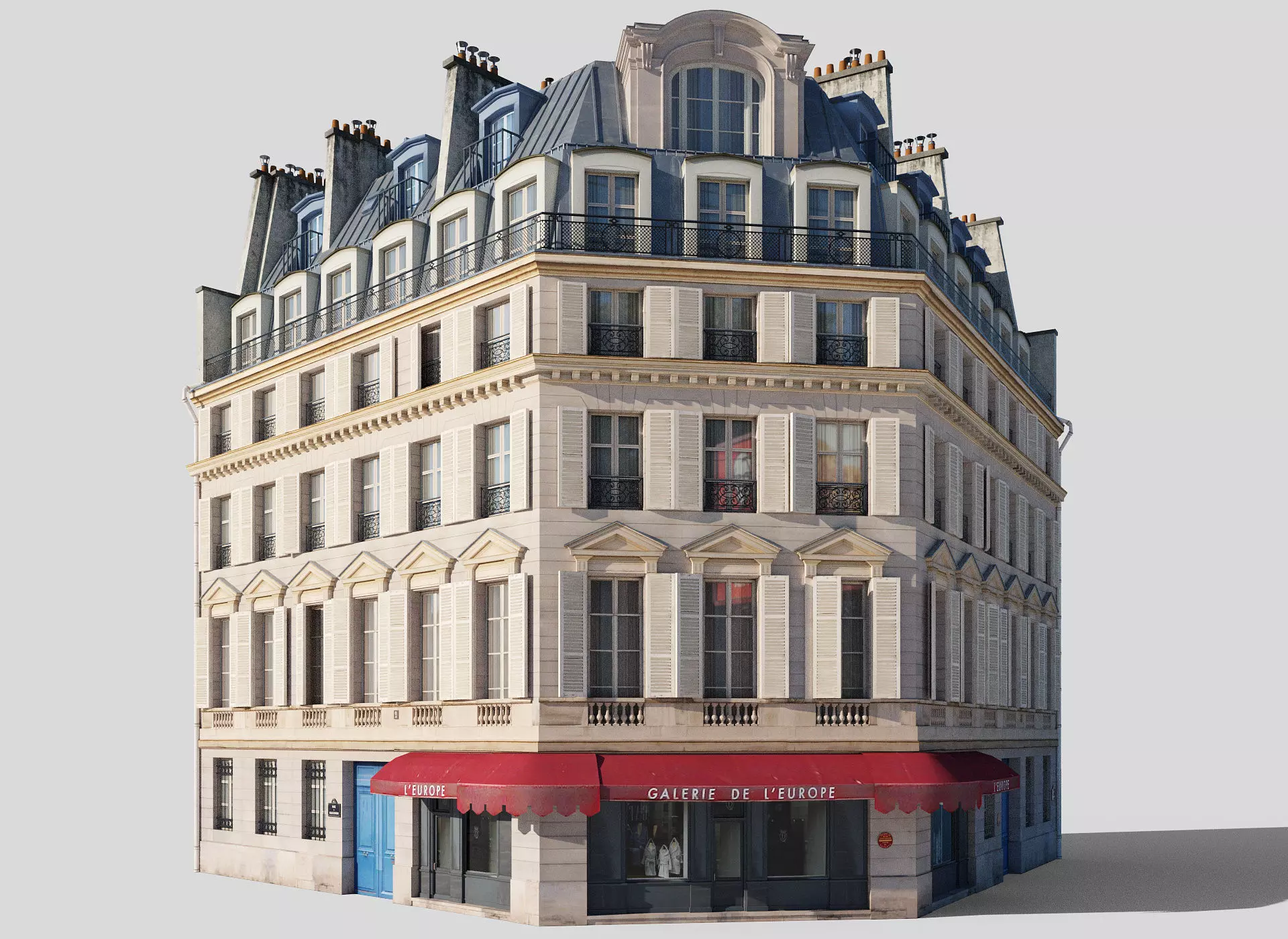 High-quality 3D model of a classic Parisian corner building. Perfect for urban visualizations, architectural projects, and games. The model represents Haussmann-style architecture with detailed facades, mansard windows, and ground-floor storefronts.