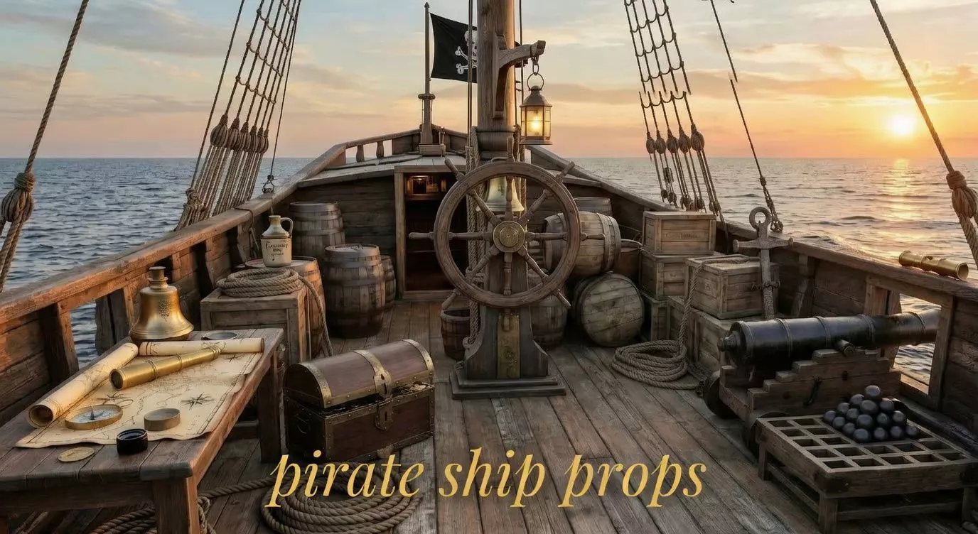 Build complete pirate ship deck and captain quarters environments. From the helm wheel to the cannon balls every item is an iconic pirate ship prop. All wood and metal construction with weathered aged materials.