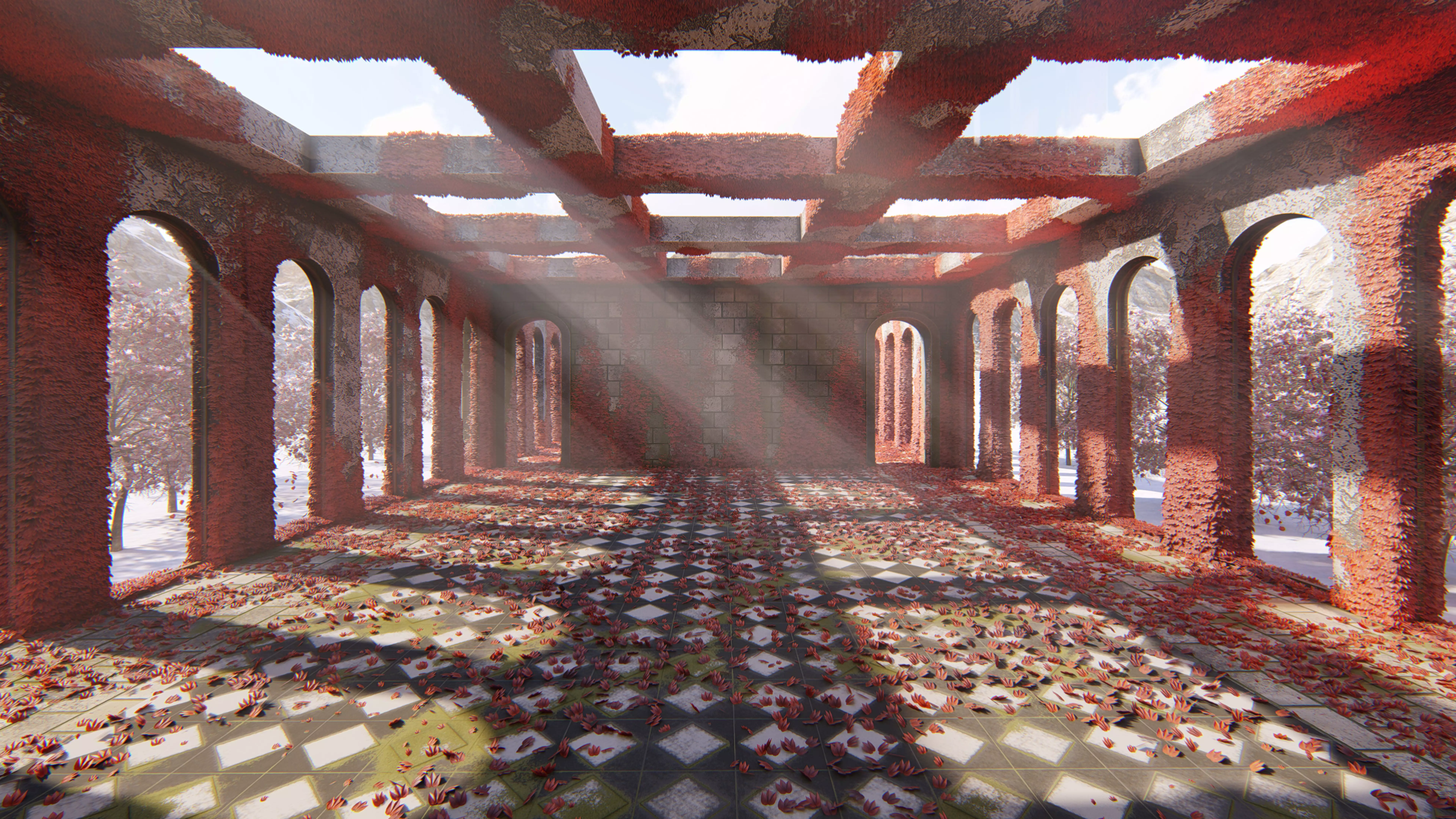 CASTLE HALL, OLD ARCHES COVERED WITH RED MAPLE TREE LEAVES, WITH WHITE BACKGROUND, CENTRAL PINAO COULD BE ADDED (PRESENT IN THE 3d FILES), CASTLE MOOD, ABANDONNED PLACE, MYSTERIOUS MOOD